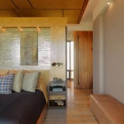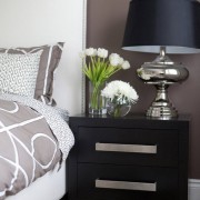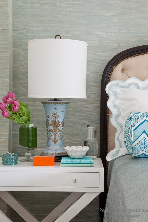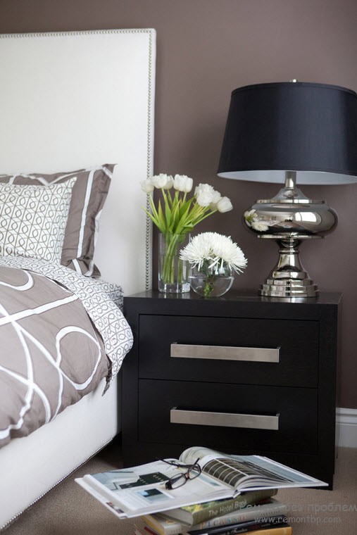 Возможно использование журнального столика и прикроватной тумбы из стекла. Но, лучше если этот же элемент мебели будет выполнен из дерева.
