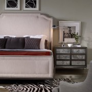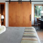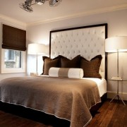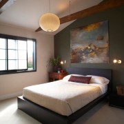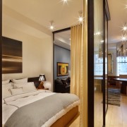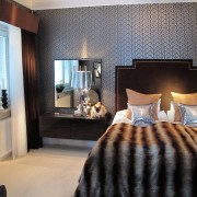 Кровати, без изголовья располагаются в центре комнаты. Шкафы-купе с матовой плоскостью дверей, устанавливаются в дальний угол комнаты, маскируясь под стену. Возможен вариант расположения шкафа, как разграничителя рабочей зоны и зоны отдыха. Прикроватный столик, тумбы и другая мелкая мебель располагается свободно, без привязки к крупным мебельным объектам. Цвет мебели может быть контрастным по отношению друг к другу. Нет необходимости сочетать цвета мебели, поскольку мебель выбирается под стены и пол. Столы, кровати и столики стоящие отдельно от стен, выбираются в сочетании с цветом пола. Шкафы и тумбы, стоящие вплотную к стенам, выбираются в соответствии с цветом стен.