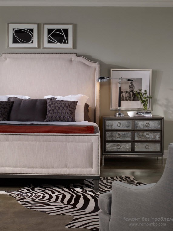 Декор и аксессуары. Декоративные особенности интерьера сводятся к минимуму. Практически все атрибуты должны иметь фактическое назначение, поэтому из декоративного ряда можно выделить бытовую технику, обязательную для комнаты отдыха, а так же вазы из непрозрачного фарфора. Часто для декорирования используют безрамные картины и зеркала.