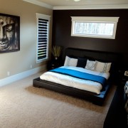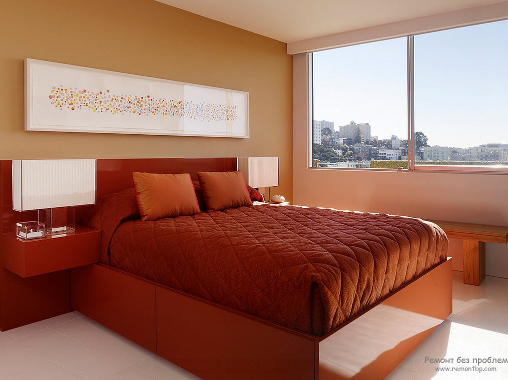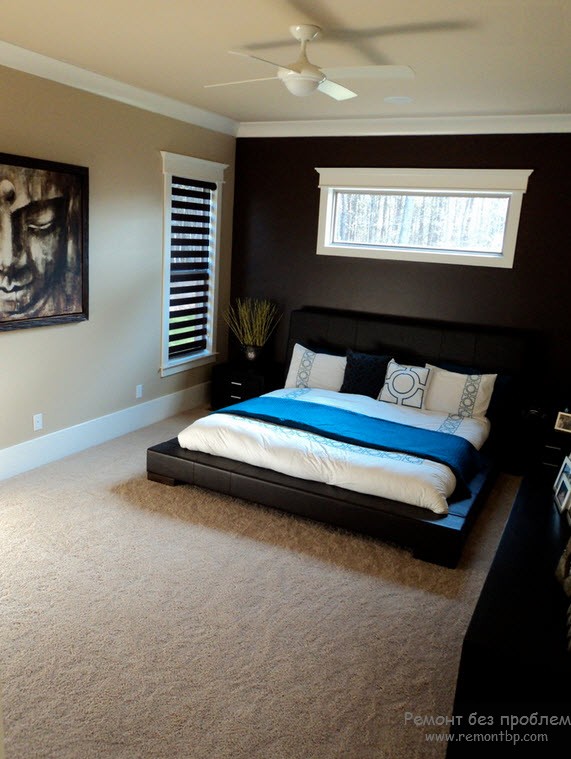 Второй вариант более сложный по подбору оттенков, но создает мягкую и расслабляющую атмосферу, более подходящую для идеи спальной комнаты. Природные тона водяной лили, рисовой бумаги, светлого бамбука подойдут для фонового цвета. Расставить акценты помогут розово-коричневый, черный, темно вишневый и цвет охры. Декоративные дополнения и текстиль выбирается под цвет стен, и имеют более насыщенный оттенок.