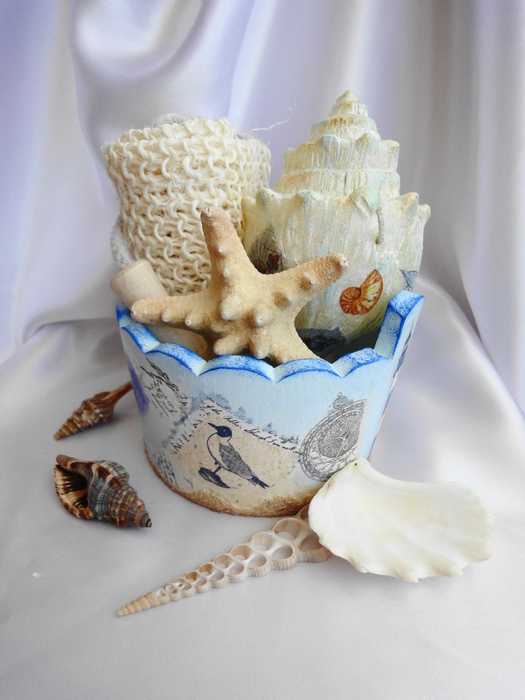 Дары моря (камешки, морские звезды, ракушки). Практически незаменимым декором при создании морского стиля является галька или декоративный камень, сделанный под гальку. Их можно использовать при оформлении плинтуса, выложив широкой полосой на месте соединения стен с полом, при декорировании стен кухни, также у входной двери или в ванной можно увидеть коврики, выполненные из гальки. Серые оттенки, которые хорошо сочетаются с синим и с коричневым цветом, будут также отлично смотреться в любой комнате, оформленной в морском тематике. Правда, в такие комбинации важно добавлять яркие краски и детали, выдержанные в этом же стиле.
