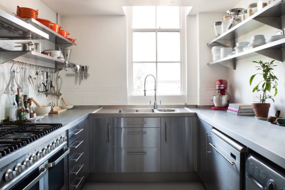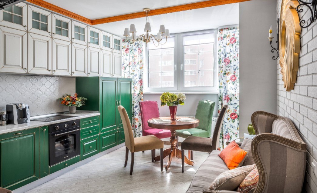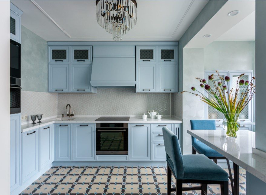 Что касается выбора цветовой палитры, то для оформления интерьера кухни с такой площадью лучше использовать светлые оттенки, которые можно разбавить яркими деталями. Также не стоит увлекаться слишком крупными принтами или рисунками и обилием декора.