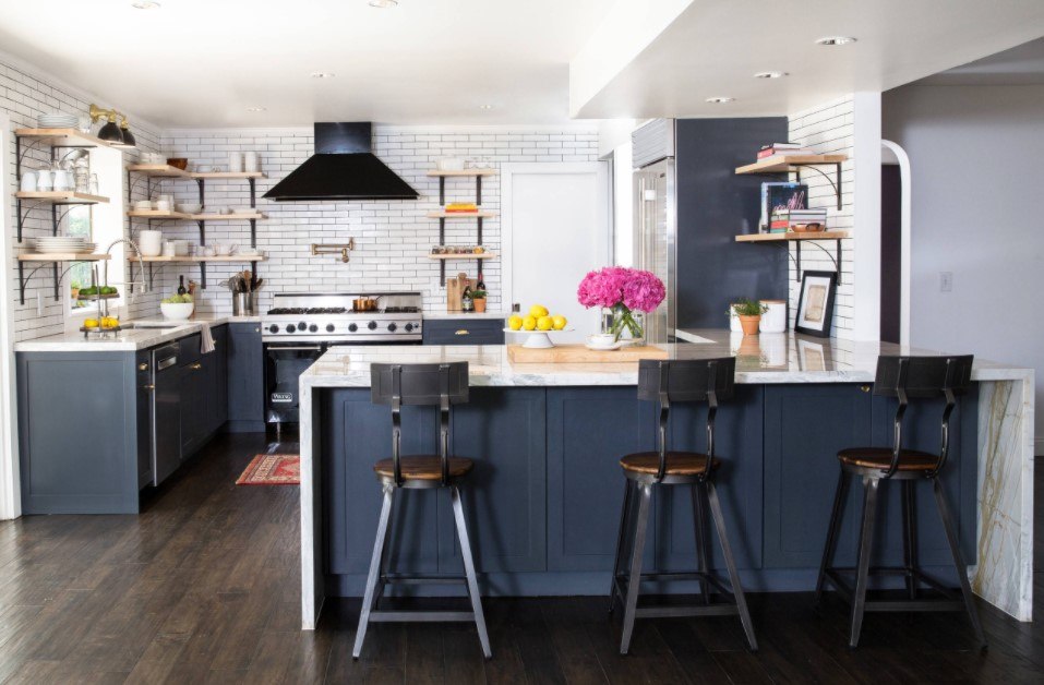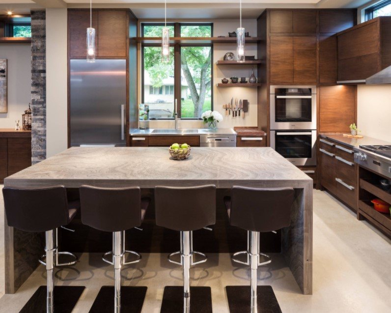 Рациональная организация пространства в кухне, плавно переходящей в гостиную, подразумевает наличие барной стойки – весьма многофункциональной детали интерьера, при помощи которой можно условно разделить общую площадь на рабочую и обеденную зоны. При этом форма и дизайн барной стойки могут быть абсолютно разными. Главное, чтобы конфигурация этой конструкции не занимала слишком много места, не мешала членам семьи передвигаться по кухне, а её дизайн идеально вписывался в стилистику оформления всего интерьера. Для обустройства рабочей зоны в такой кухне следует отдать предпочтение угловому или линейному гарнитуру.