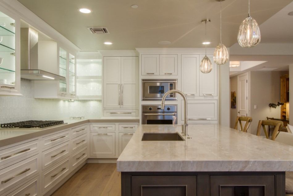 Наиболее практичное расположение раковины – в самом углу, а на некотором расстоянии от неё варочная панель. Здесь важно разместить обе зоны так, чтобы любые манипуляции с водой не контактировали с газом. С одной стороны углового гарнитура можно выделить место под холодильник. С другой, поставить вместительный пенал. Обеденный стол лучше расположить по центру комнаты, а над ним обязательно подвесить люстру. Также следует позаботиться о дополнительной подсветке в области рабочей зоны. При угловой планировке эта часть кухни всегда остаётся немного затемнённой.