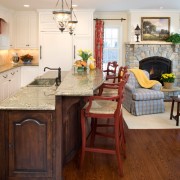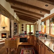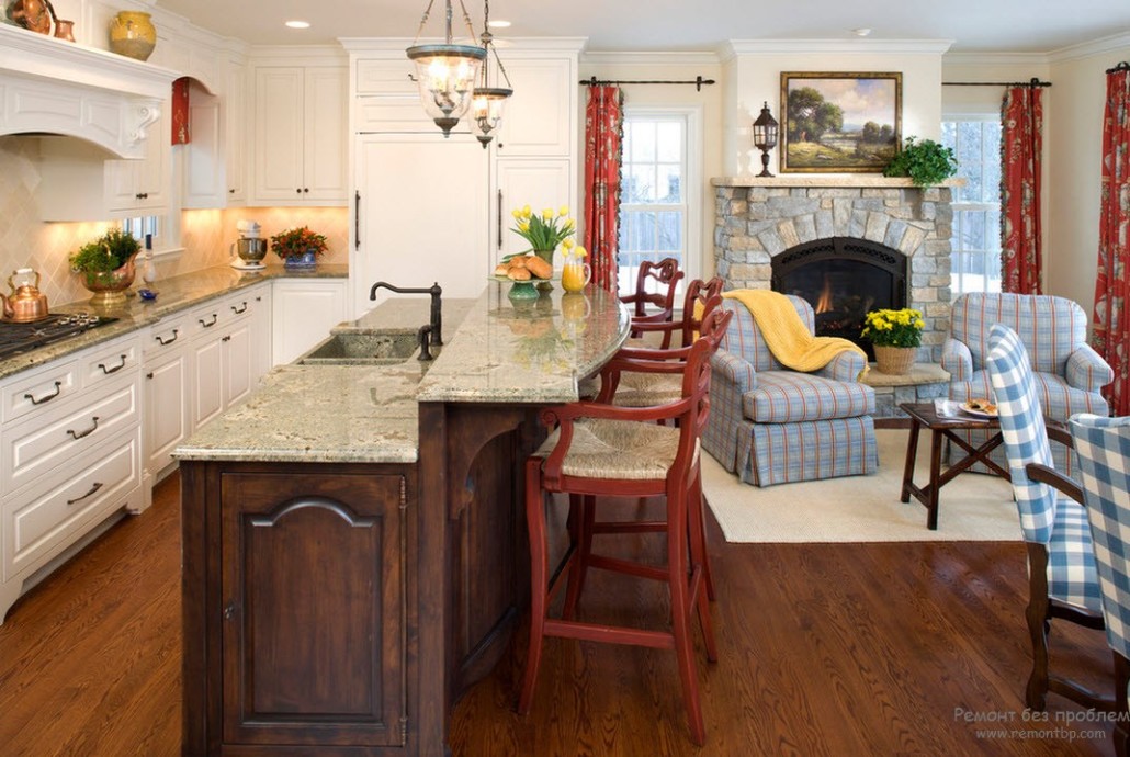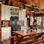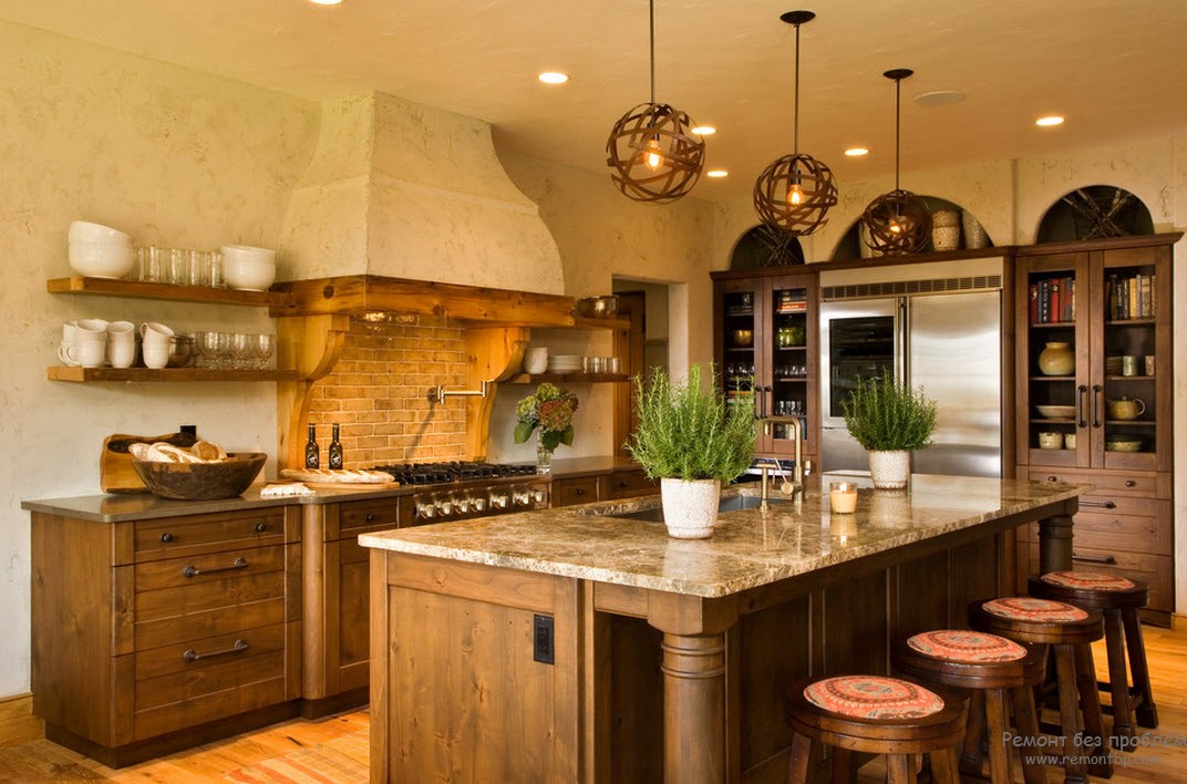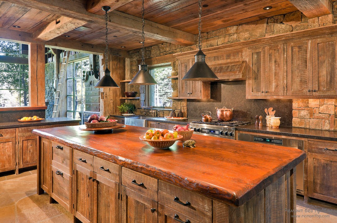 Здесь тоже царит натуральное дерево, но окутанное простой и непритязательной атмосферой. Это самый менее затратный стиль, который можно создать из старых предметов, слегка освежив их. В отношении мебели используется грубая шлифовка, обжиг, браширование, то есть обработка жесткой щеткой. Помимо дерева в кантри кухне используется натуральный или искусственный камень.