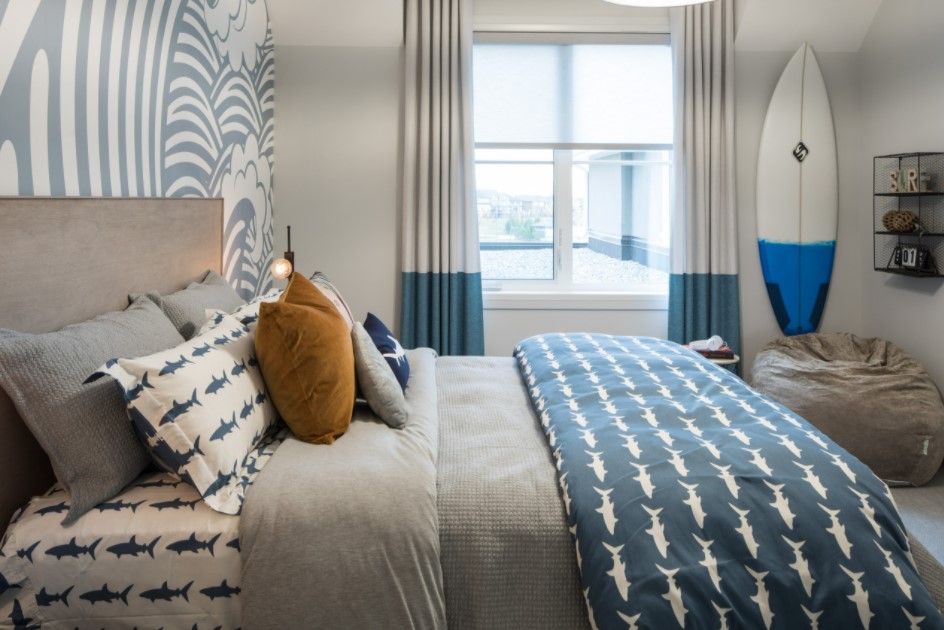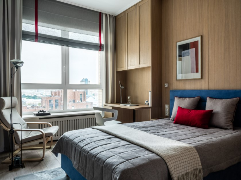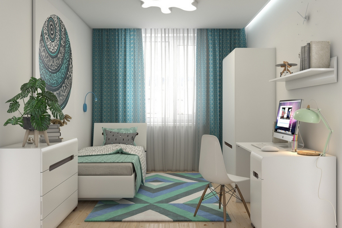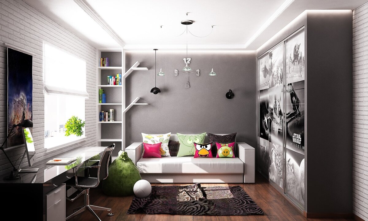 В интерьере обязательно должно найтись место для письменного стола, шкафа, мебельных полок и стула-кресла. Очень приветствуется декорирование любыми тематическими картинками. Также требуется распланировать зонирование. Даже маленькую по размерам спальню можно зонировать при помощи выдвижного дивана, который может служить спальным местом.