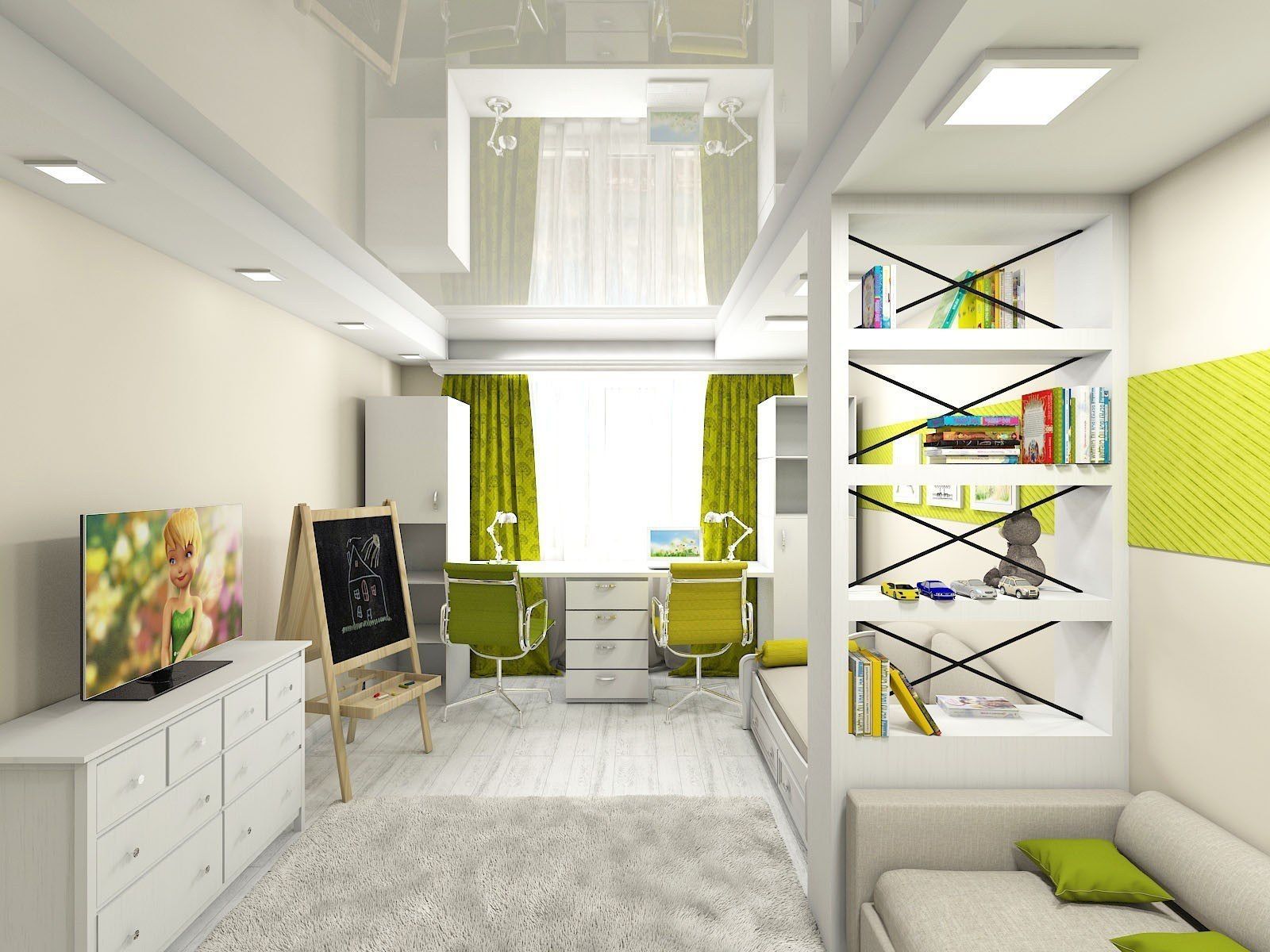 Следует побеспокоится о достаточном освещении. Отличным решением для детской станет установка регулируемого светового потока или применение «умных» осветительных приборов. Условно увеличить ощущение высоты комнаты поможет натяжной потолок с глянцевой поверхностью.