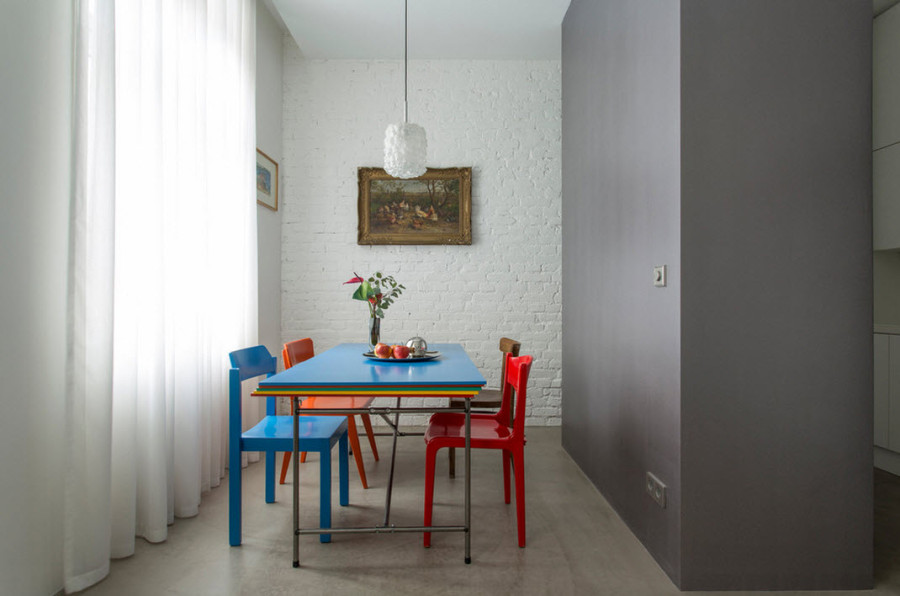 После бело-серых тонов кухонного пространства взор требует яркости, и столовая зона в этом плане оправдывает все ожидания. Колоритная обеденная группа из яркого стола и стульев разных цветов способна поднять не только настроение, но и аппетит.