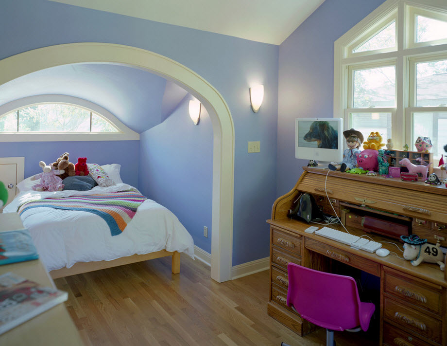 Если площадь комнаты ребенка достаточно большая, то лучше всего не ограничиваться традиционным набором мебели, включающим в себя кровать, стол, шкаф и комод, а проявить хоть немного фантазии. Благо, сегодня существует просто огромный выбор игровой мебели, причем, не обязательно дорогой: горки, острова, кровати-чердаки, скалодромы и пр. Есть диванчики в виде игрушек и много чего интересного.