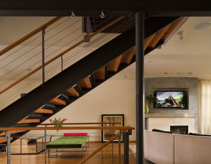 Вместе с тем существуют и минусы. Для того, чтобы удачно и гармонично вписать металлическую лестницу в интерьер, необходимо ее облагородить и придать ей более эстетичный вид. Сделать это можно с помощью обшивки деревом, что, кстати, придаст ей еще большей прочности и надежности, да и изготовление не потребует больших затрат.