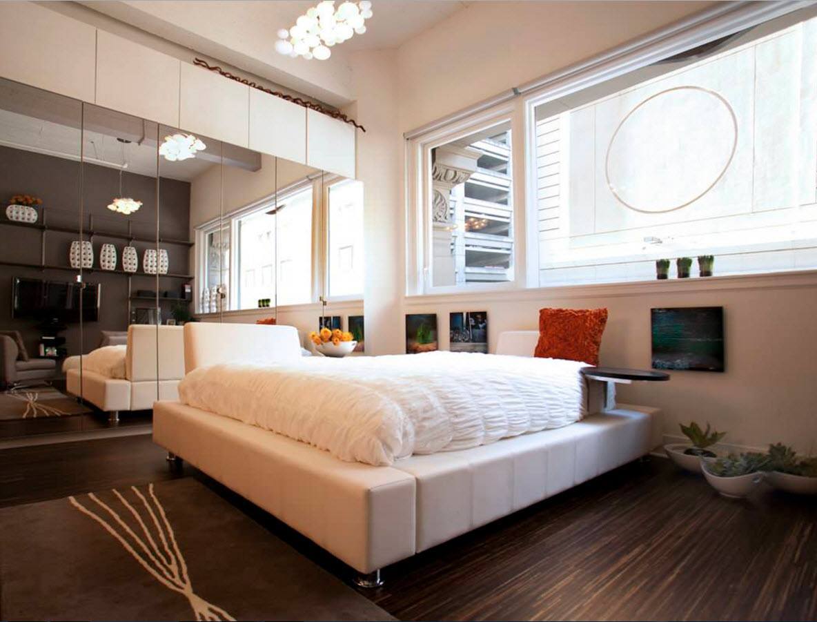Открытую планировку можно назвать «классикой жанра» при оформлении квартир студий. Расположение всех функциональных сегментов жилища без каких-либо ограждений позволяет сохранить ощущение свободы даже на небольшой площади. В новых постройках многоквартирных домов, как правило, уже изначально предусмотрены высокие потолки и достаточно большие окна. Если же вы организуете студию из типовой постройки прошлого столетия путем сноса межкомнатных перегородок, постарайтесь использовать возможность расширения оконных проемов. Чем больше естественного света будет в небольшом пространстве, тем комфортнее и удобнее будет в нем находиться, тем ощущение простора будет очевиднее.