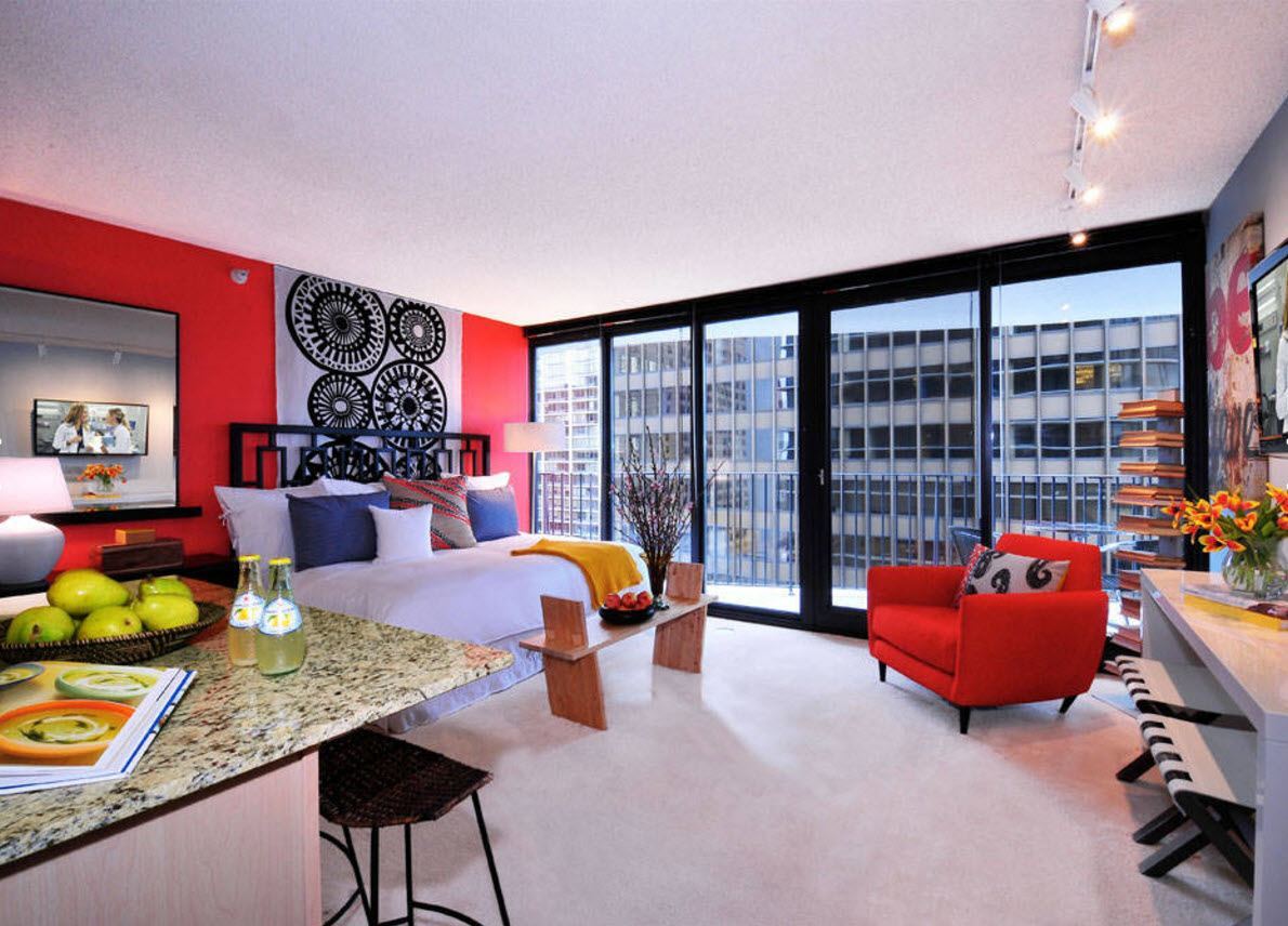 Конечно, в небольших пространствах использование светлых оттенков предпочтительно для визуального увеличения. Но это не значит, что ваше скромное по размерам жилище не достойно ярких, активных акцентов. Белоснежный потолок, светлая отделка всех стен кроме одной – акцентной, а также применение ярких тонов для оформления мебели и предметов декора. Подобную обстановку точно нельзя будет назвать скучной или тривиальной. Яркие, колоритные цвета способны зарядить нас положительной энергией, взбодрить, поднять настроение. Особенно подобные дизайнерские приемы рекомендованы в помещениях с большими панорамными окнами, способными обеспечить студию необходимым уровнем естественного освещения.