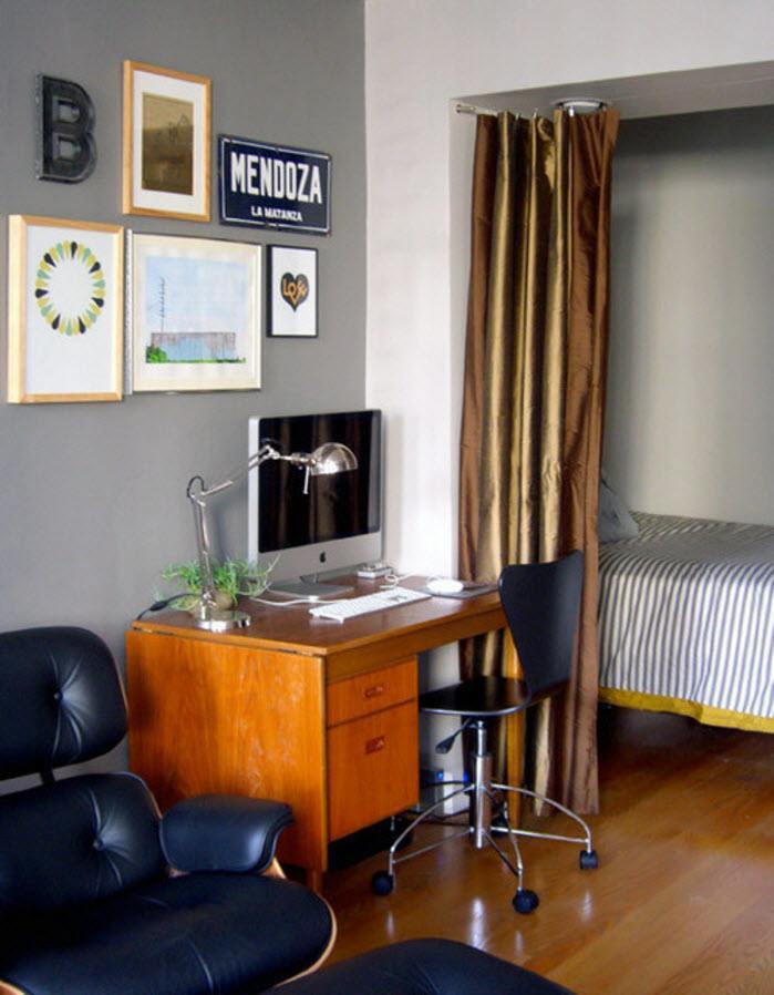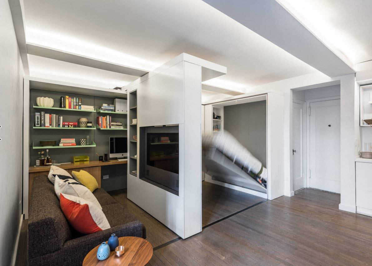 В помещении, которое является одновременно гостиной, спальней и кабинетом существенно облегчить задачу планировки сможет откидной механизм кровати, которая компактно прячется в шкаф. Дверь этого шкафа на колесике способна отъехать в сторону и стать своего рода перегородкой для отделения спального пространства от зоны гостиной. Часть дверцы откидывается по модели секретера и становится рабочим местом – гостиная превращается в кабинет.