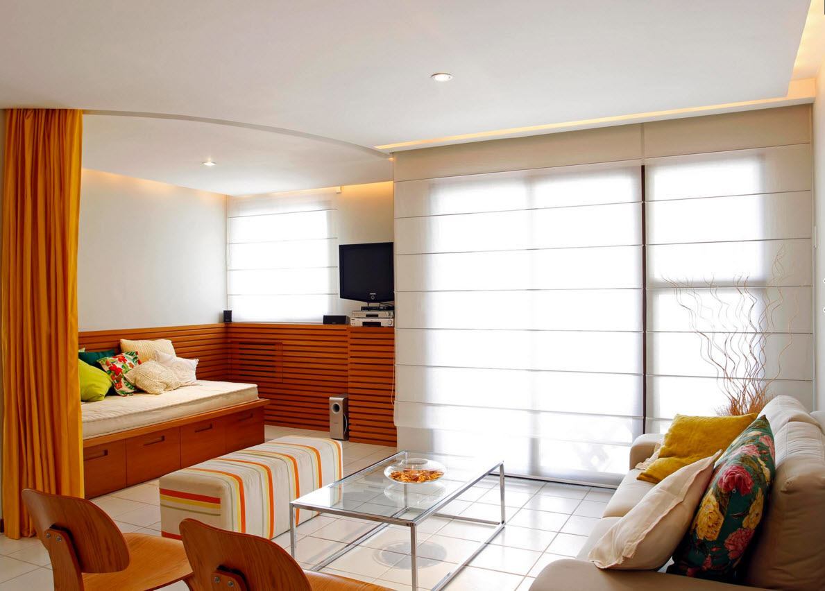 Решение для тех, кто не хотел бы возводить перегородок для отделения спальной зоны от остального пространства, но желал бы сохранить некоторую приватность этого сегмента жилища – шторы. Если в квартире подвесные потолки, то прикрутить рельсы для свободного перемещения шторок не составит труда. В случае с натяжными потолками придется организовать опоры для установки карнизов. Некоторые дизайнеры намеренно упрощают задачу и натягивают обычную веревку для подвешивания оригинальных занавесок.
