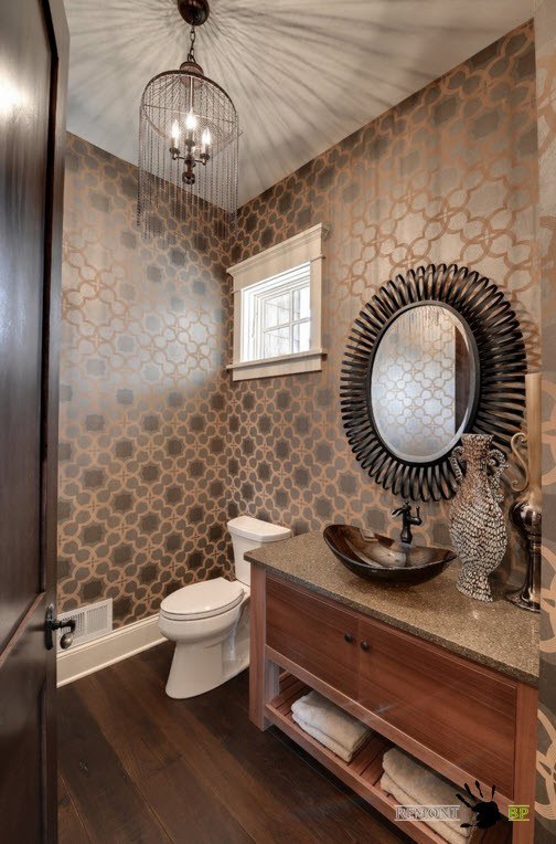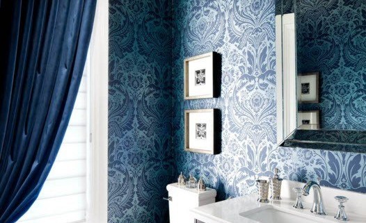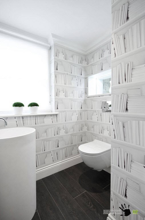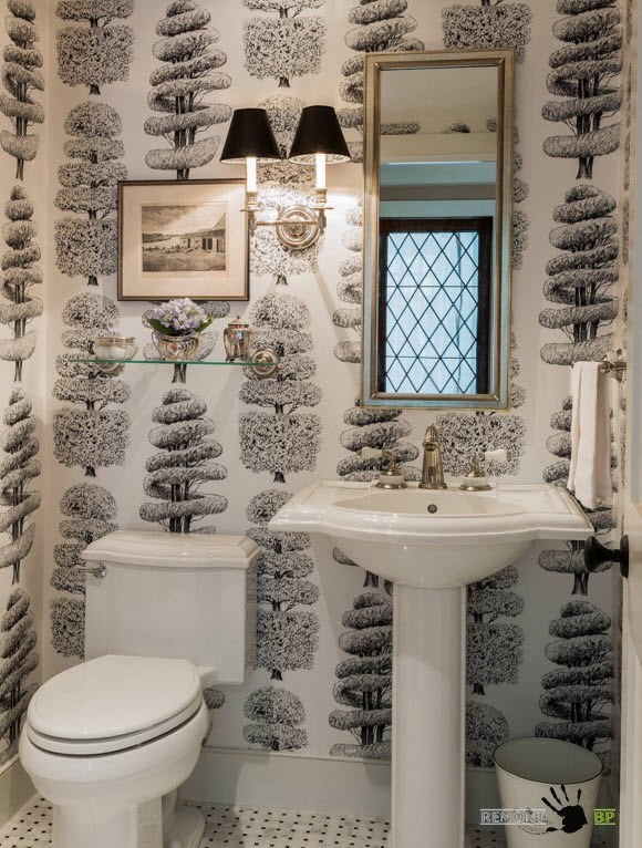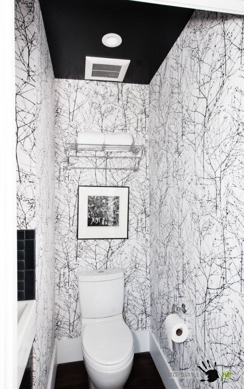 С помощью черно-белых обоев с рисунком можно добиться оригинального оформления утилитарных помещений – санузлов, прачечных и даже ванных комнаты. Сочетание белоснежной сантехники, темных элементов отделки или меблировки и черно-белого принта обоев создают весьма гармоничный образ пространства.