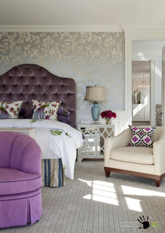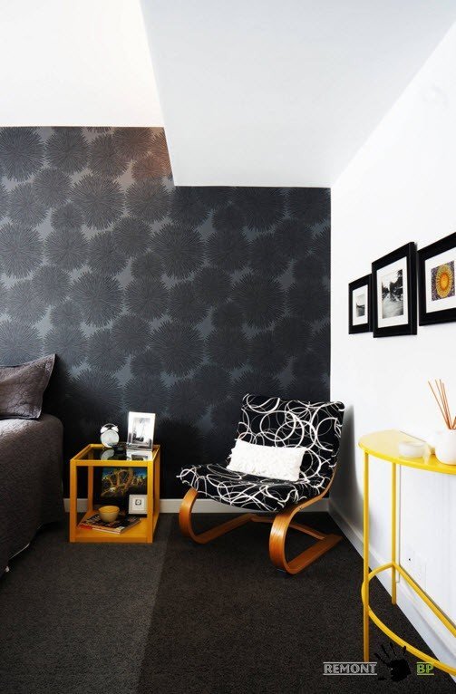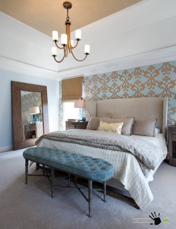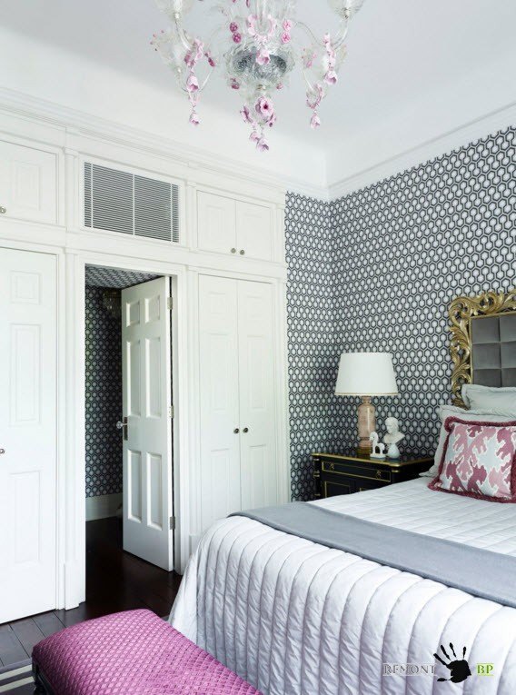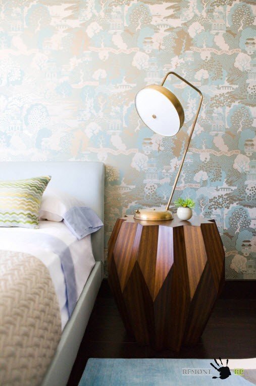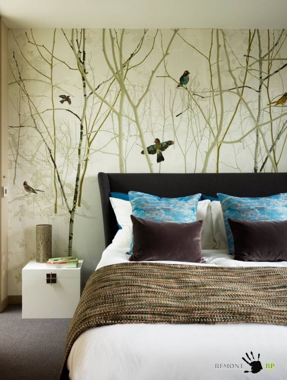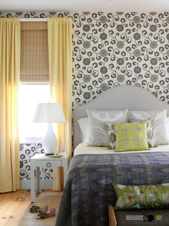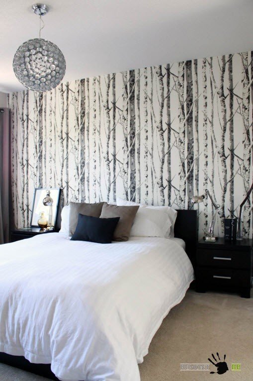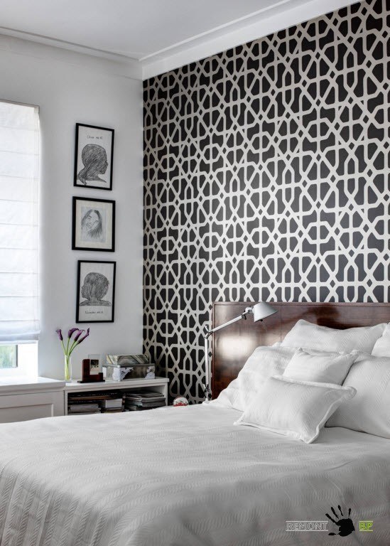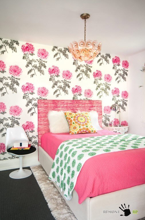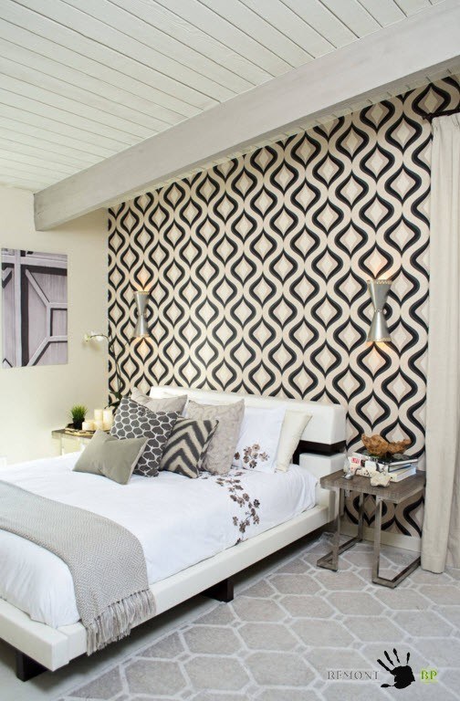 Для спальни также возможно использование яркого цвета рисунка на обоях. Чтобы не поднимать градус эмоциональной составляющей атмосферы помещения в моменты, когда нужно успокоиться и подготовиться ко сну, используйте яркие обои в качестве отделки акцентной стены за изголовьем кровати.
