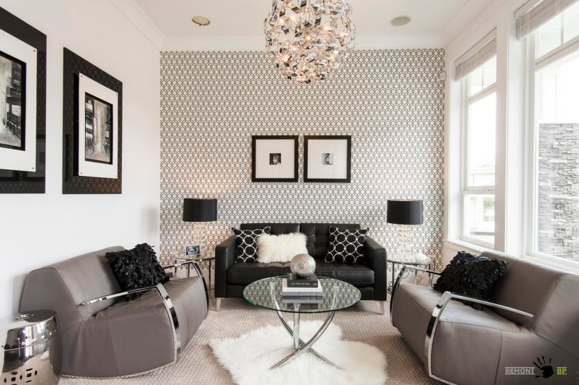 Крупный черно-белый рисунок на акцентной стены подходит для оформления просторного помещения гостиной. Для комнаты с подобной отделкой отлично подойдет мягкая и мебель с обивкой яркого цвета и колоритные предметы декора. Полученный в результате образ помещения будет современным, интересным и динамичным.