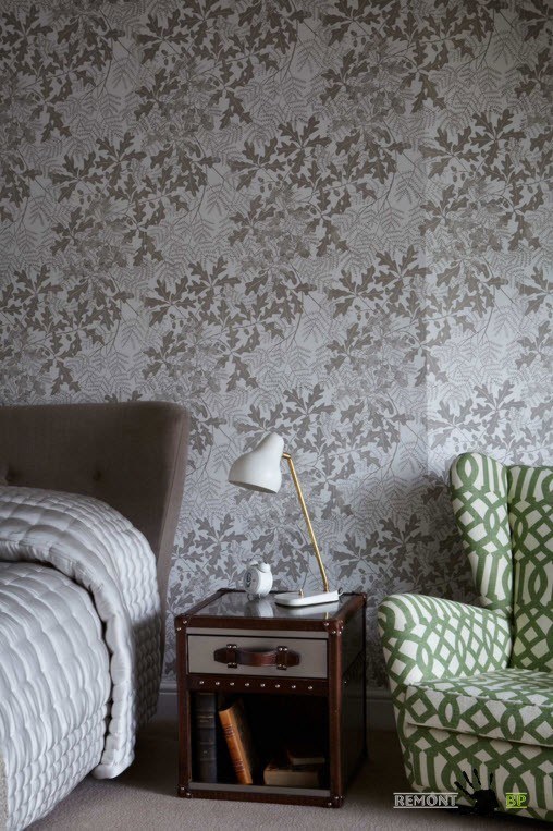 Обои с растительным рисунком отлично смотрятся в спальне. Чтобы не перегружать отделку комнаты для сна и отдыха крупным рисунком, используйте для отделки стен однотонные обои, а для акцентной поверхности за изголовьем кровати – изделия с рисунком. Интерьер будет гармоничным, если удастся повторить принт обоев или его часть в текстиле декоративных подушек, элементах драпировки окна или ковровом покрытии.