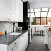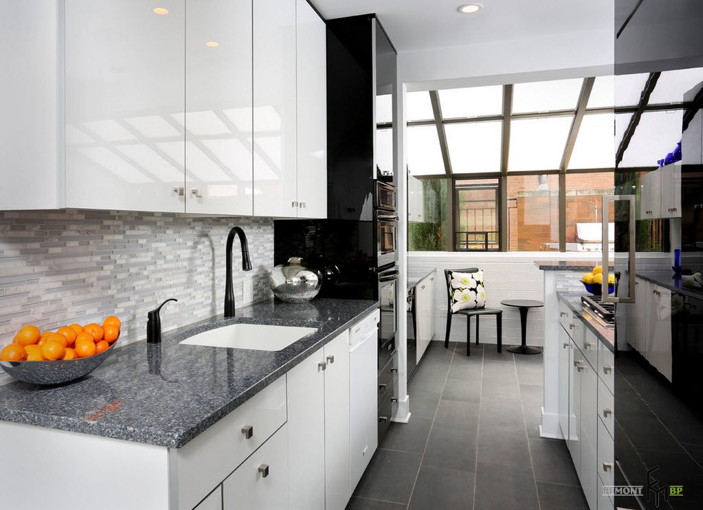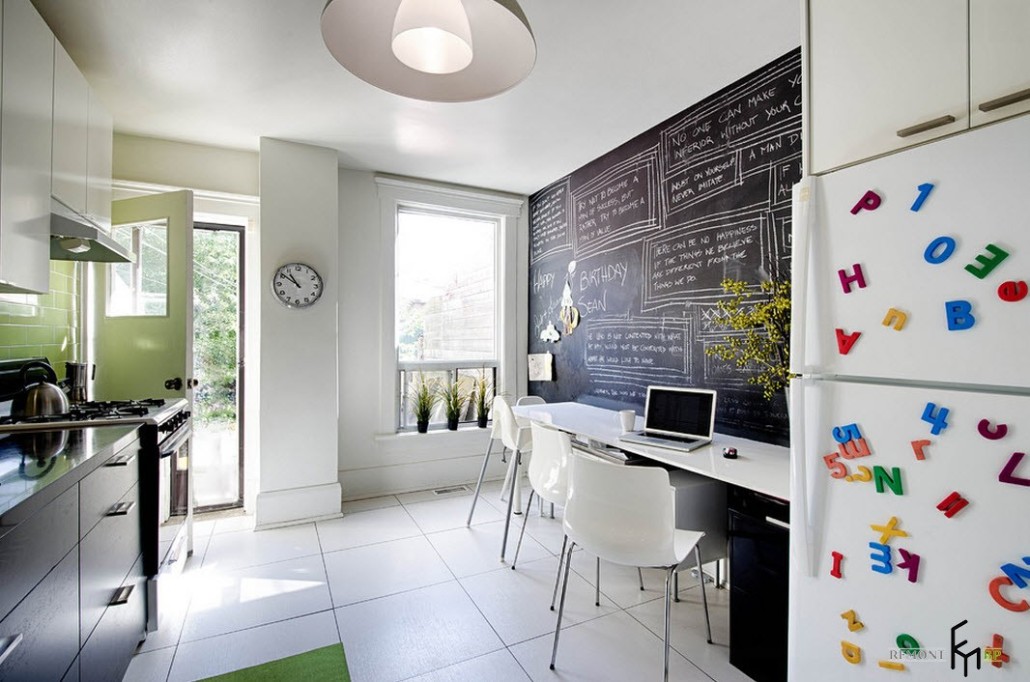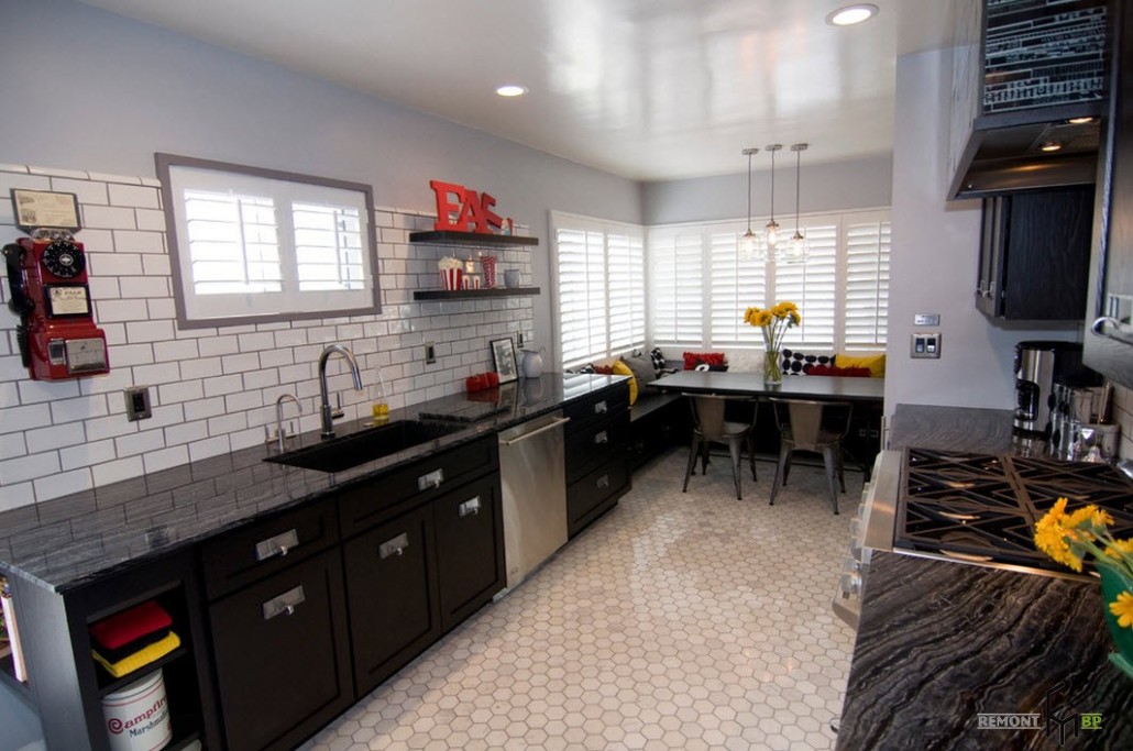 Помимо цветовых решений придать кухне оригинальности можно с помощью различных схем выкладывания. Можно использовать два разных оттенка и наклеить их в шахматном порядке. В итоге получится интересное контрастное решение, которое освежит интерьер. При этом следует учитывать, что остальное оформление должно быть умеренным в выборе красок. Если не соблюсти это правило, то кухня получится излишне пестрой.