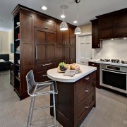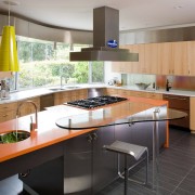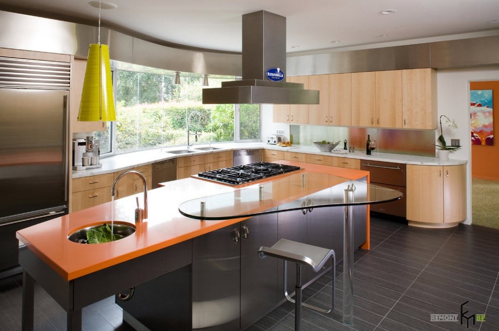 Сделать интерьер кухни оригинальным можно с помощью необычных по форме элементов. Многие производители пополнили свой ассортимент плиткой нестандартной формы. Круглые детали придают любому интерьеру мягкость и сглаживают резкие линии и переходы. С наклеиванием такой плитки связаны некоторые сложности. Швы между элементами могут выглядеть грубо. В качестве альтернативы могут выступить шестиугольники и восьмиугольники. Стыковать такие плитки намного проще.