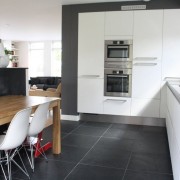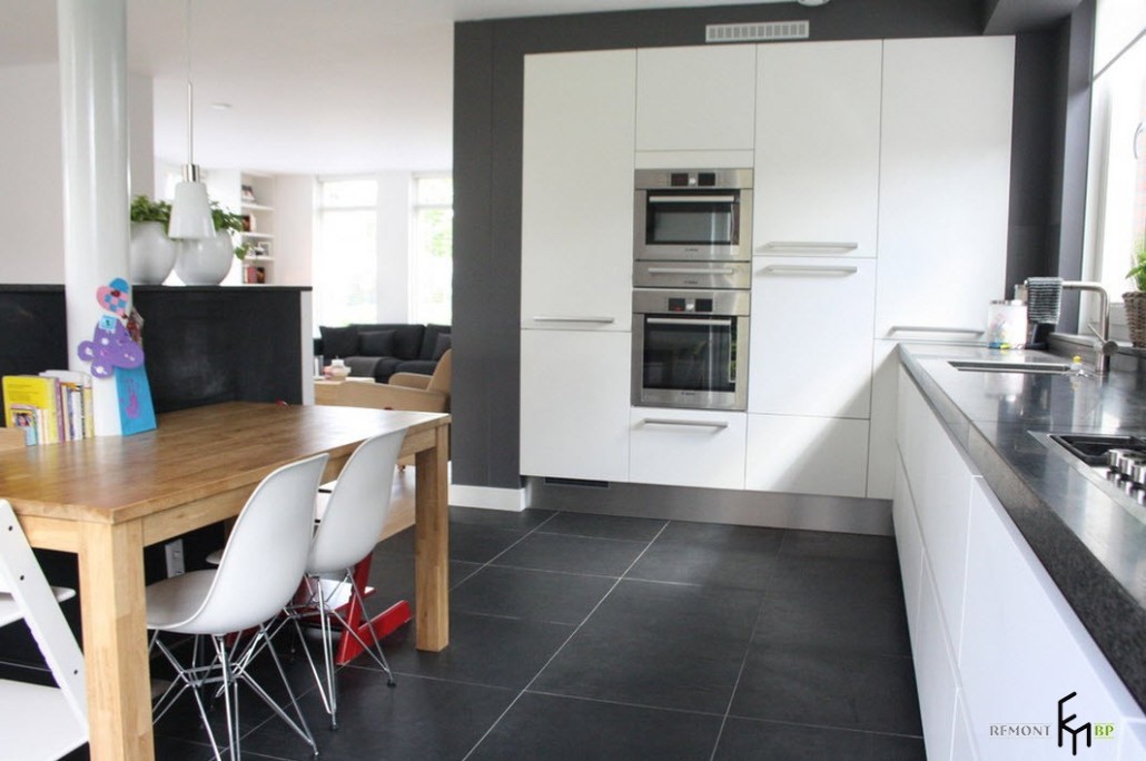 Совершенно не обязательно, чтобы оттенок пола совпадал со стенами или мебелью. Можно даже не выдерживать их в одной цветовой гамме. Контрастные полы уже стали популярными много лет назад и сохраняют это свое свойство по сей день. Но самым простым способом уравновесить помещение по цветовому признаку все же является сочетание выбранного напольного покрытия с еще хотя бы одним предметом в обстановке кухни: занавесками, мебелью, стенами или чем-то другим.