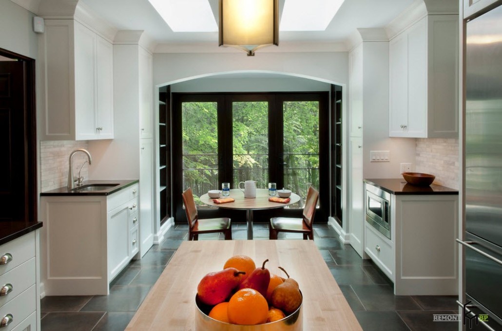 Некоторые способы выкладывания плитки чем-то схожи с наклеиванием паркета. Особенно это ярко выражено, когда для напольного покрытия используются детали, по форме напоминающие паркетную доску. Такой способ укладки позволит визуально изменить форму комнаты. Эффективнее всего иллюзия расширения пространства будет работать в случае размещения получившихся «стрелочек» от центра к стенам кухни. Кроме этого можно использовать более сложные узоры, например, спираль.