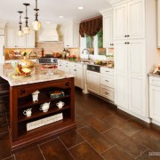 Еще одним оригинальным способом украшения пола кухни будет применение различных по форме и размеру плиток. С помощью таких деталей можно создавать по-настоящему оригинальные узоры, но для этого необходимо заранее просчитать схему укладки на всю площадь кухни, чтобы не ошибиться с количеством элементов. Чередовать кусочки можно по-разному. Это не будет полноценной мозаикой, но что-то общее у технологии выкладывания все же есть. Например, можно использовать несколько мелких деталей подряд и одну крупную, после чего последовательность повториться. Наиболее популярным способом использования плитки разного размера является наклеивание мелких и крупных деталей в равном количестве равномерно по всей площади кухни.