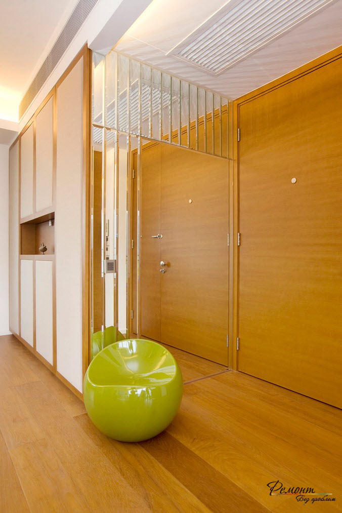 Превосходным средством визуального увеличения пространства служит установка зеркала на одной из стен. Но при этом освещение прихожей должно быть правильно организовано. Зеркала не должны быть в рамке, так как в этом случае они будут делить на части стену и делают ее зрительно меньше. Поэтому зеркала лучше укреплять на стене. Но они могут быть встроены в мебель. Следует уточнить, что зеркала визуально увеличивают пространство в том случае, когда интерьер комнаты выполнен в светлых тонах. В крайнем случае, противоположная зеркалу стена должна быть отделана в светлых тонах.