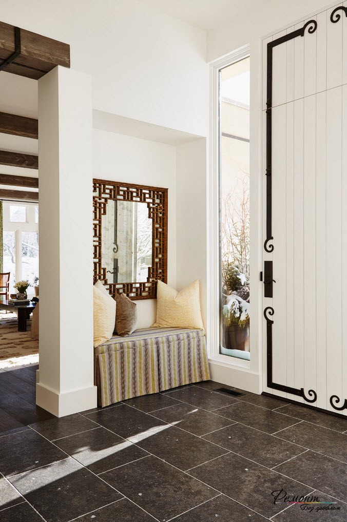 Напольное покрытие из большой керамической плитки также позволит вам «расширить» пространство прихожей, особенно, если она отличается размерами и уложена мозаикой или диагональю. Аналогичный зрительный эффект производит уложенный по диагонали или поперек прихожей ламинат.