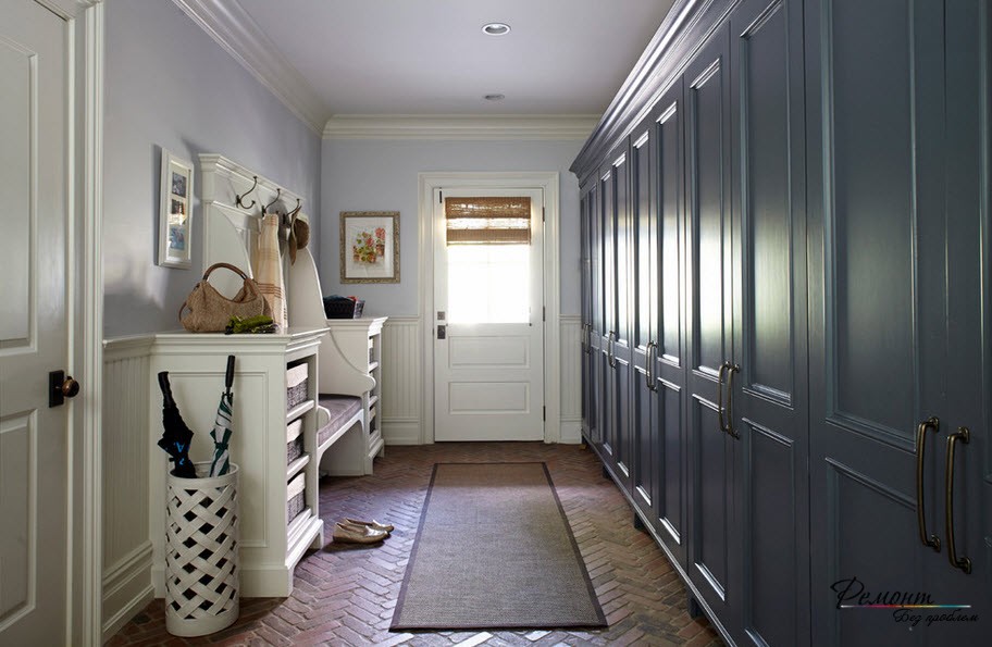 Прежде всего, не будем нарушать законы дизайна – начнем с зонирования. Вы скажете, какие еще зоны на таком маленьком пространстве? Обыкновенные и реальные. Например, зона, где вешается повседневная одежда и зона, где хранится сезонная одежда и всевозможные бытовые предметы. Ведь практическое назначение прихожей и состоит в том, чтобы разгрузить жилую площадь от многочисленных домашних предметов, скрыть их существование от посторонних глаз. Каким образом эти зоны выделить? Самым функциональным вариантом является установка с одной стороны вешалки для одежды и тумбочек для обуви, а на противоположной стороне – встроенные шкафы для прочих неходовых вещей. При этом встроенные шкафы должны иметь другой цвет, нежели вешалка.