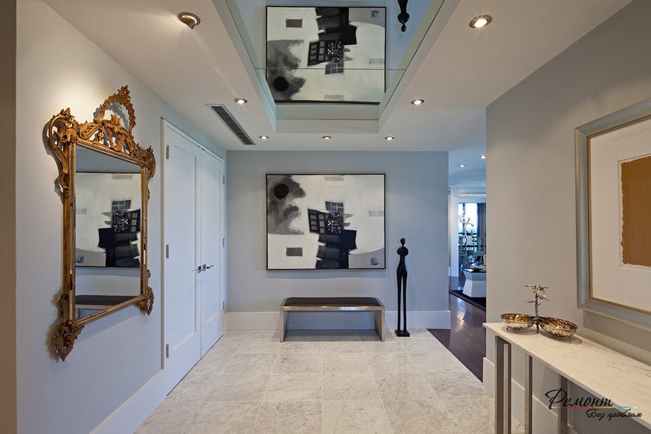 Превосходным дизайнерским решением является облицовка одной из стен зеркалами. Благодаря этому визуально увеличивается пространство комнаты. Особенно это эффективно в небольших коридорах, прихожих.