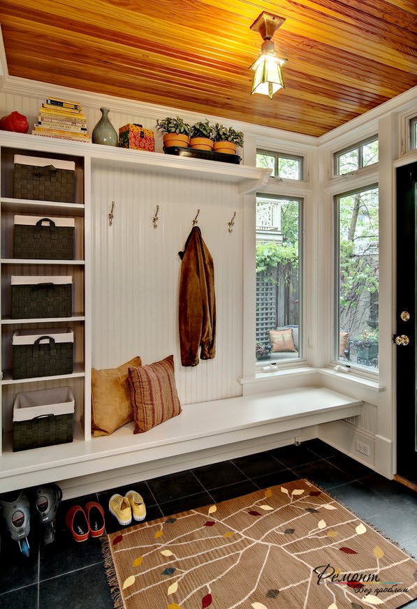 Не последнюю роль в дизайне прихожей и коридора играет потолок. При этом допускается некоторый его контраст с рекомендуемыми светлыми тонами стен. Например, коричневый, светло-коричневый цвета в сочетании со светлыми стенами создают особый комфорт в этих помещениях.