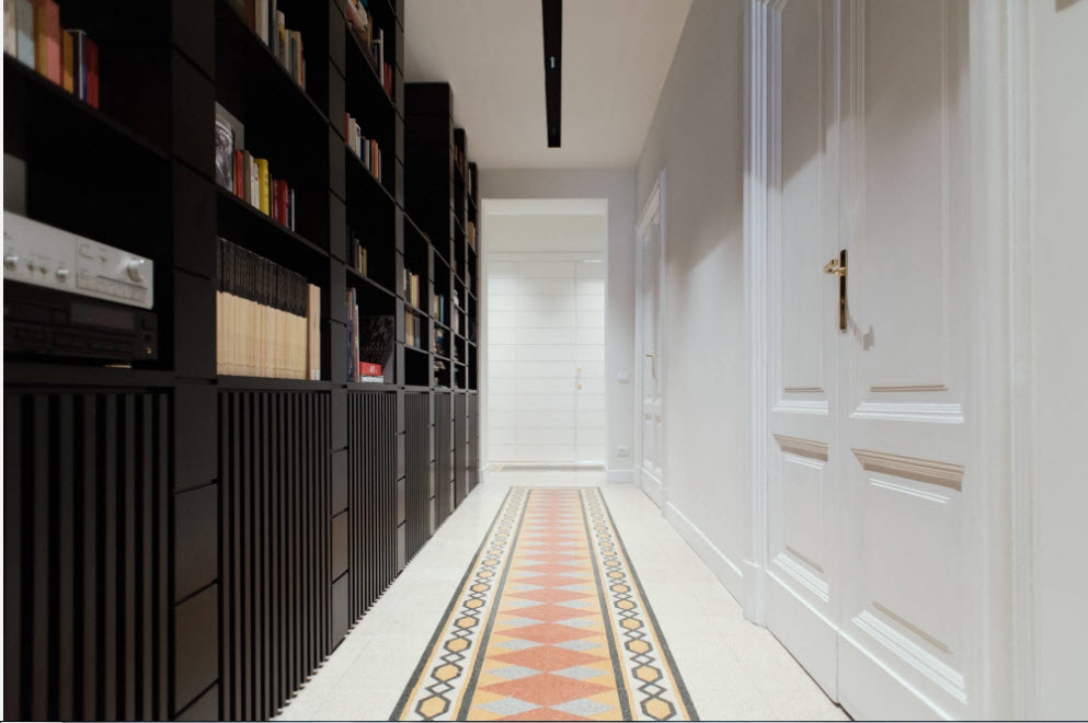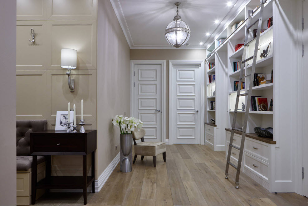 В стандартных квартирах постройки прошлого столетия коридоры чаще всего имеют очень скромную площадь и установка мебели в них не предусматривается. Но если ваш коридор обладает достаточной шириной, чтобы беспрепятственно могли разойтись два человека, то грех не использовать эту возможность. Как правило, хозяева предпочитают устанавливать неглубокие стеллажи с открытыми полками для хранения книг, документов, канцелярии. Сами сооружения могут не только служить эффективной системой хранения, но и выступать в качестве оригинального элемента интерьера, координационного центра.
