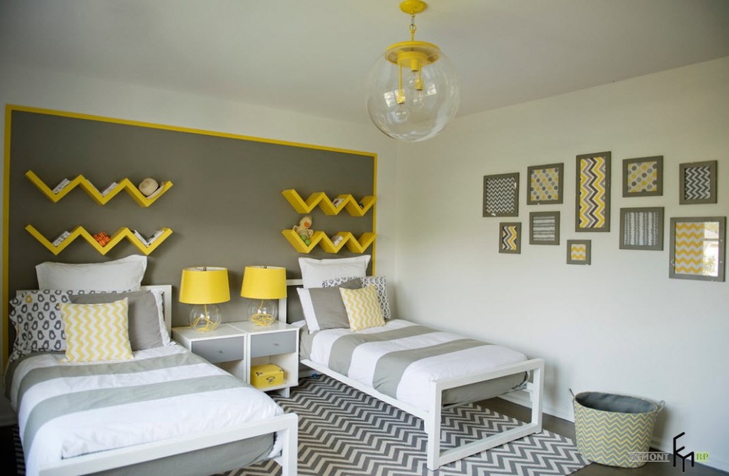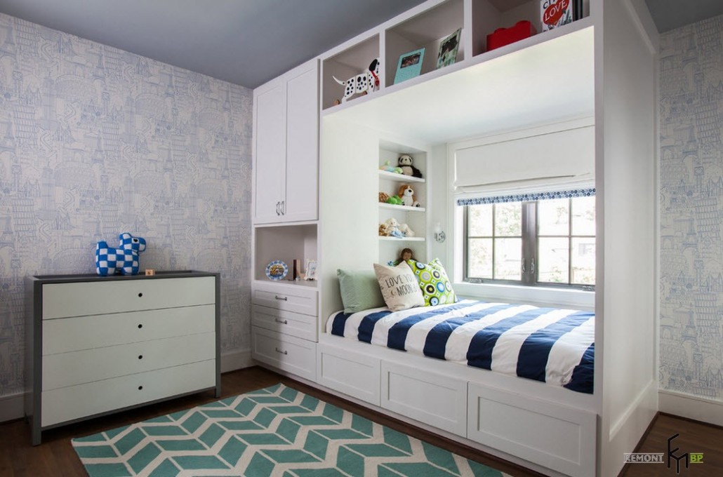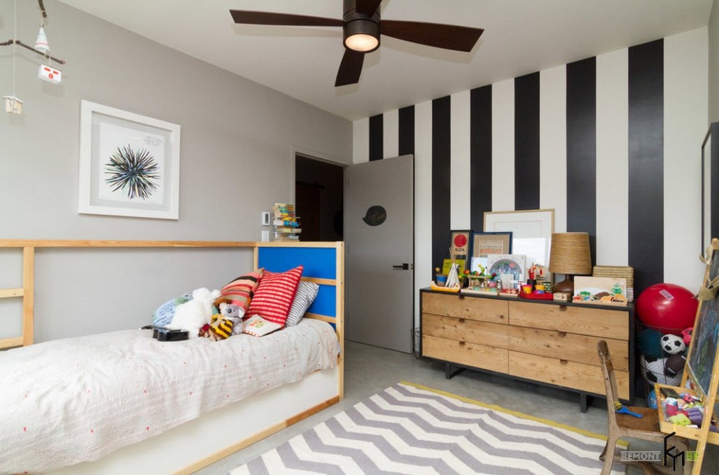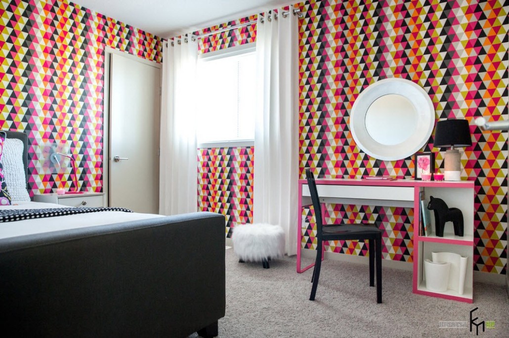 Также хорошо будут смотреться стены с геометрическими узорами и такой вариант подойдет как для мальчиков, так и для девочек, главное подобрать подходящий цвет. Такими обоями можно оклеить всю комнату или использовать их лишь на отдельных участках лишь для того, чтобы задать настроение всей комнате.