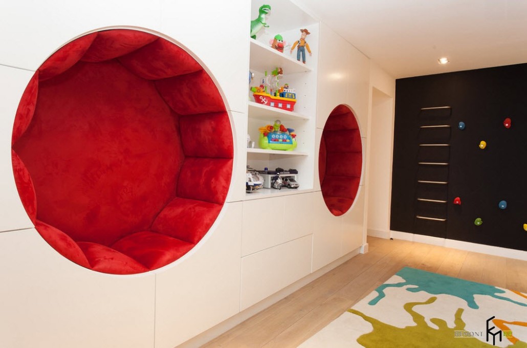 Говоря о предметах мебели нельзя не сказать, что детская это именно та комната, где уместны будут самые нестандартные решения. Такие как подвесные кресла, рабочий стол на подоконнике, оригинальные полки для книг и прочих мелочей и даже мягкие углубления в стене, служащие в качестве кресел.