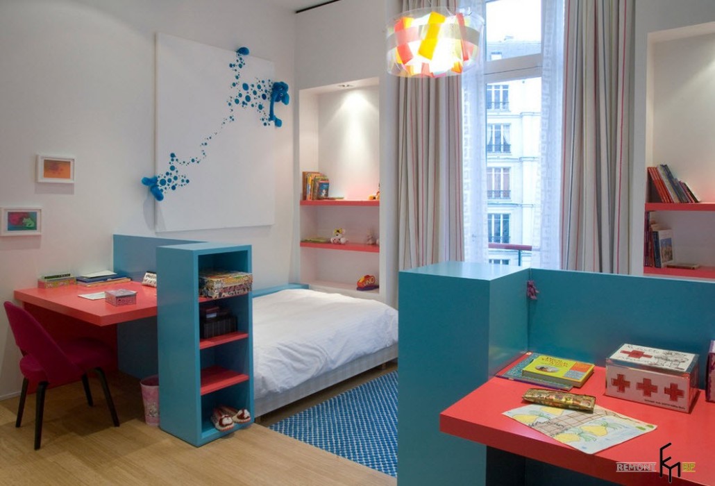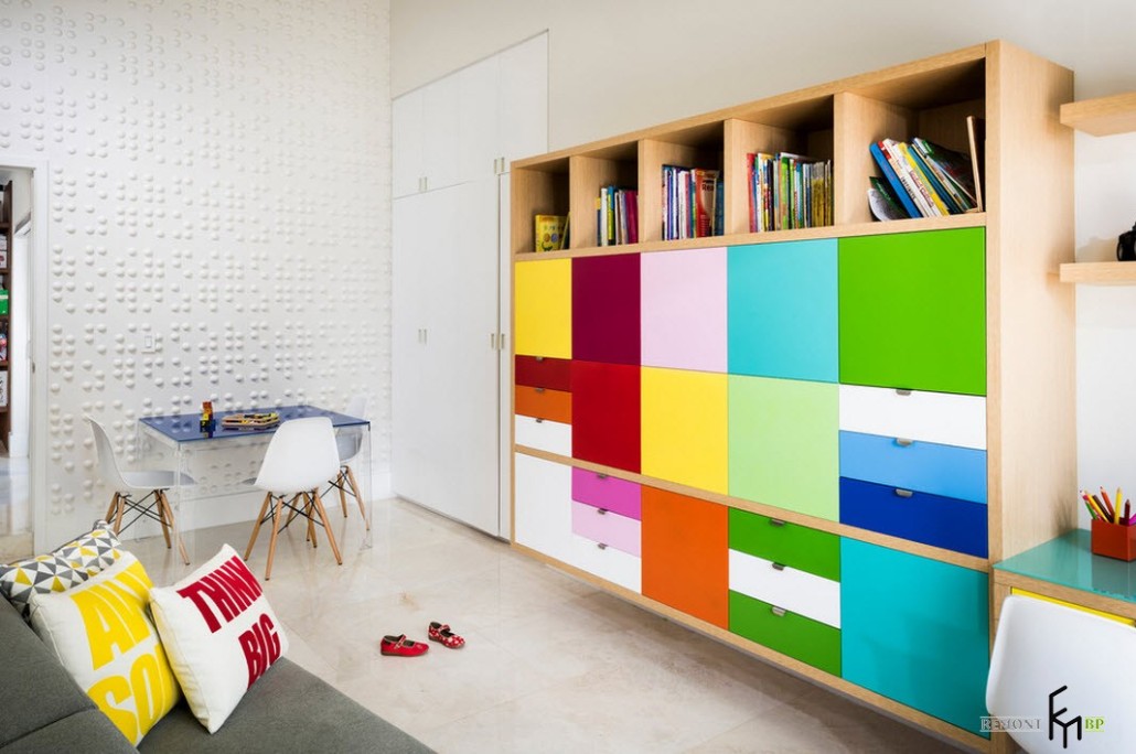 Контрастные и яркие акценты могут быть не только на стенах. Для того чтобы создать оригинальный интерьер можно использовать мебель с разноцветными фасадами. Такая идея идеально подойдет для комнаты девочки. Главное здесь подобрать идеальное сочетание стен и мебели. В качестве основного цвета можно взять белый или любой из нежных оттенков тех рких цветов, в которых выполнена мебель.