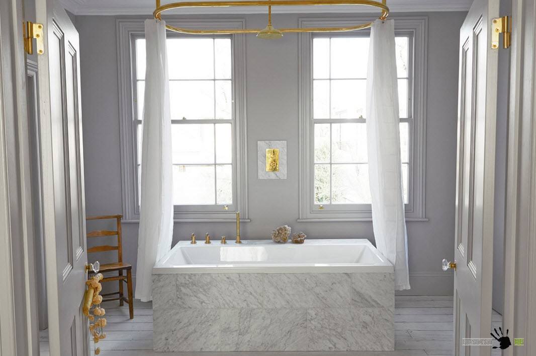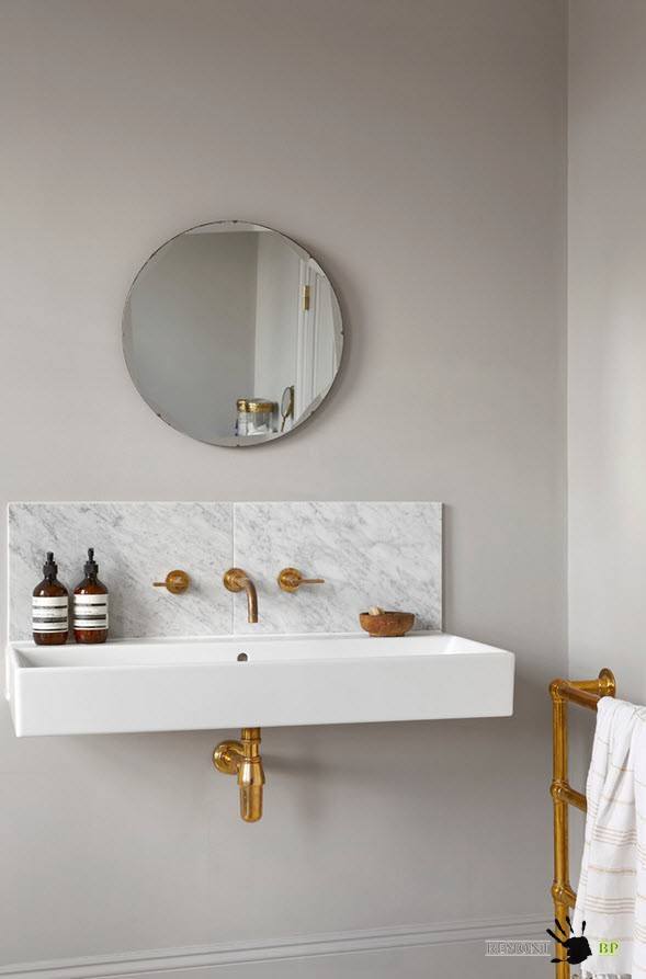 Аксессуары с золотистыми поверхностями на фоне светло-серой отделки и белоснежной сантехники смотрятся эффектно, привнося в интерьер ванной комнаты нотки роскоши.