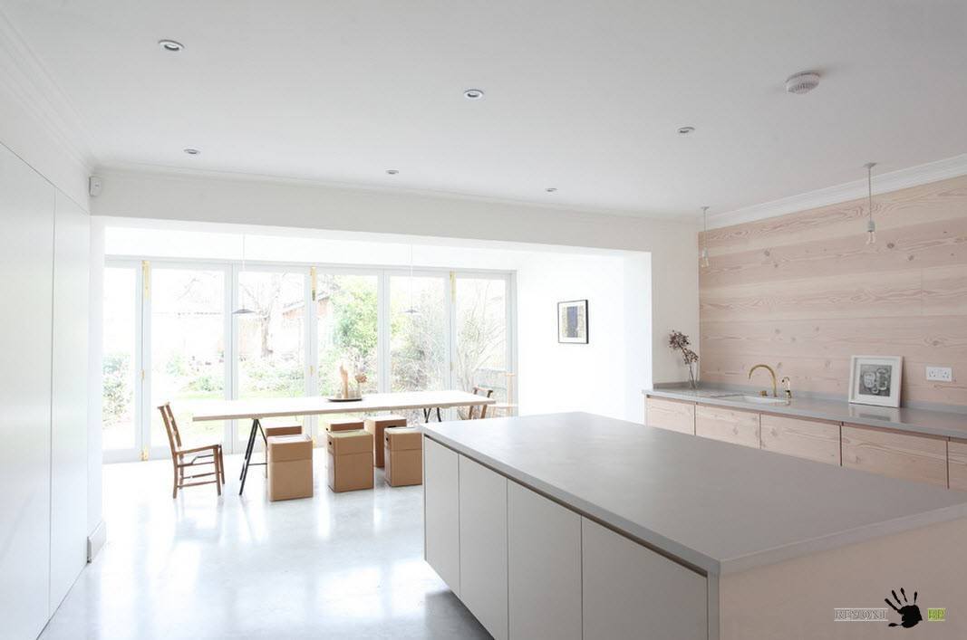Кухонная зона представляет собой однорядную планировку систем хранения, бытовой техники и рабочих поверхностей с большим островом. Белоснежная отделка присутствует не только во всех зонах многофункционального помещения, но и во всем доме. Кухонный сегмент отличается лишь присутствием стеновых панелей из светлой древесины в качестве отделки акцентной стены, выступающей и в качестве фартука над рабочими поверхностями, из этого же материала выполнены фасады кухонных шкафов.