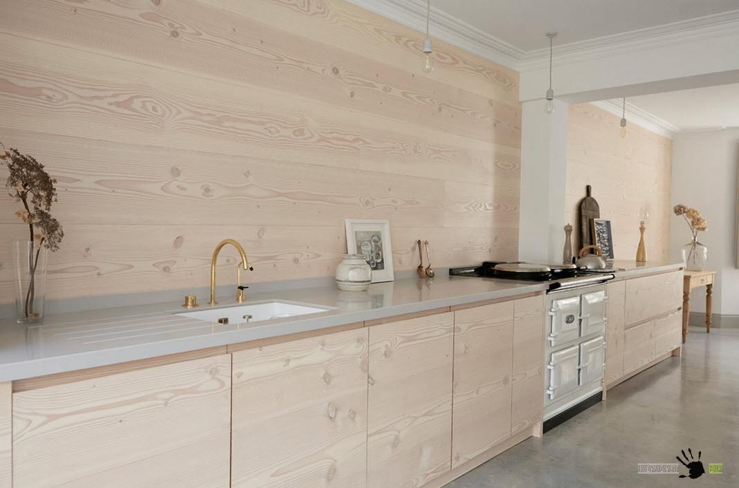 При использовании настолько длинного помещения, можно ограничиться применением лишь нижнего яруса кухонных систем хранения, освободив поверхность от рабочих зон до потолка для большего ощущения простора. Гладкие фасады кухонных шкафов и отделка стены над ними предоставляет возможность любоваться структурой древесины, ее природным рисунком, не отвлекаясь на декор или какие-либо кухонные аксессуары.