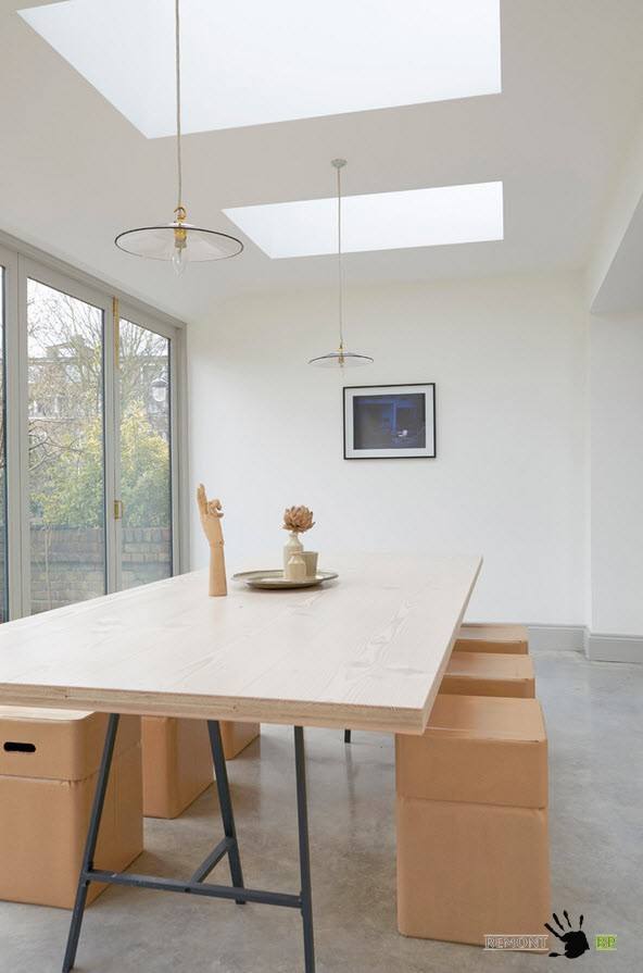 По другую сторону от кухонного ансамбля расположена столовая зона. В белоснежном светлом помещении с панорамными окнами и стеклянными дверями для выхода на задний двор, помимо прочего есть источник доступа естественного освещения на потолке. Строгая геометрия царит в этом функциональном сегменте пространства – вместительный обеденный стол со светлой столешницей и металлическими ножками и удобные стулья-пуфы приятного бежево-карамельного цвета.