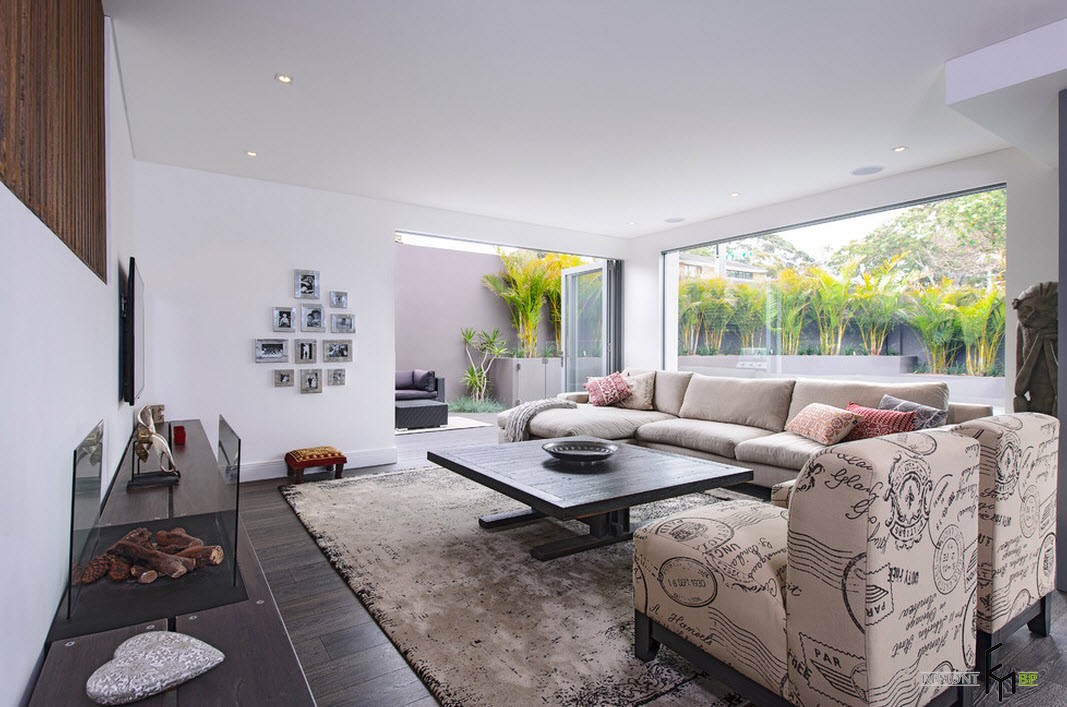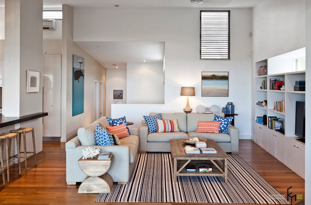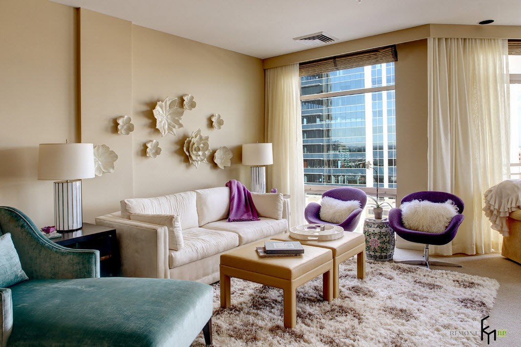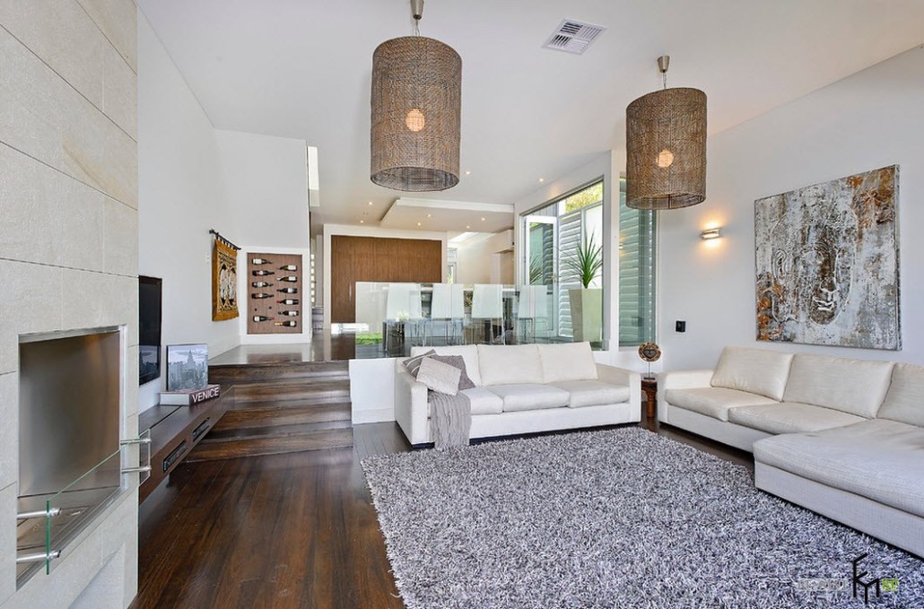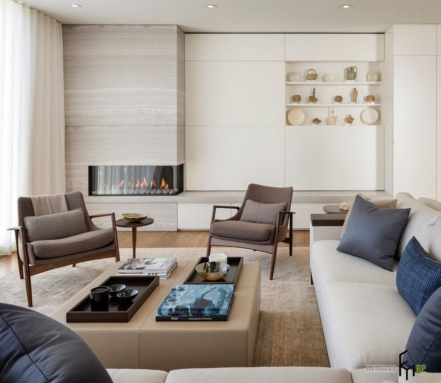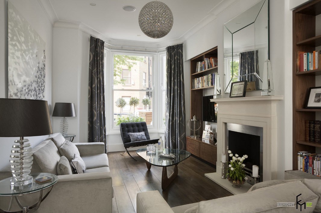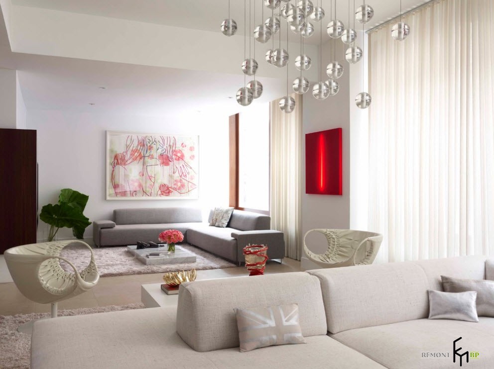Стиль минимализм привлекает форматом и продолжает тему актуальных дизайнов. Идея востребована у людей, жаждущих свободы без ущерба для уюта. Межкомнатные стены становятся лишними, и гостиная объединяется с соседней комнатой лишь аркой, раздвижными перегородками, экранами или условно зонируется освещением, напольным и потолочным оформлением. Оконные рамы требуют проема во всю стену и обходятся без гардин. Зачастую лишь скромные складки вверху напоминают о защитной функции штор по вечерам. Невесомых ощущений добавляют зеркала и прозрачные аксессуары. Гладкие светоотражающие поверхности и светлый периметр усиливают впечатления от открытого пространства.