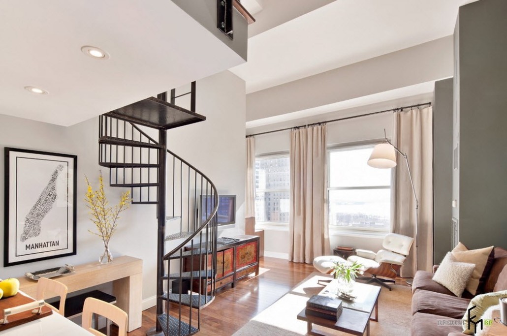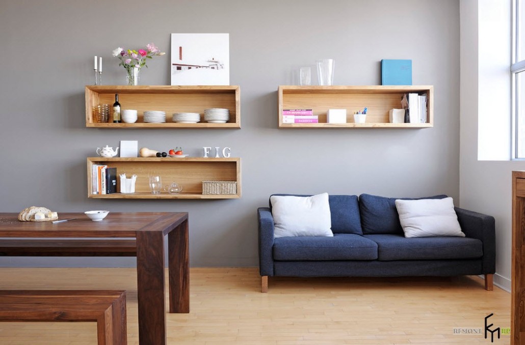 В пользу объема работает белый цвет и ряд его сложных оттенков. На стенах используются обои под покраску или демонстрируются достоинства оштукатуренных поверхностей. Допускается не больше 4-5 тоновых нюансов, среди которых контрастность становится акцентной. Это черно-белая пара, комбинация с венге или фоновое присутствие ахроматического дизайна. Фрагменты из металла, дерева и стекла, в контексте со скромным количеством основных предметов, завершают оформление.