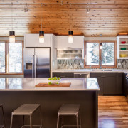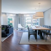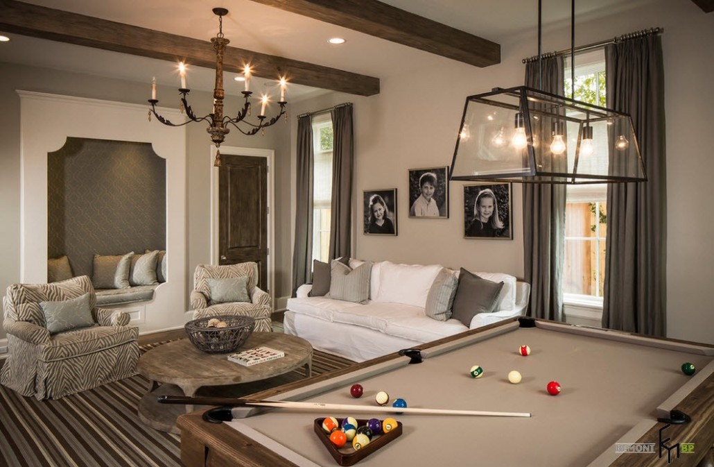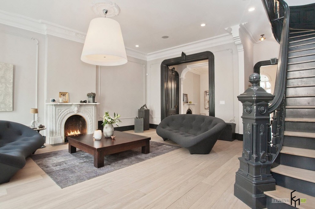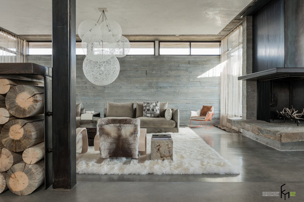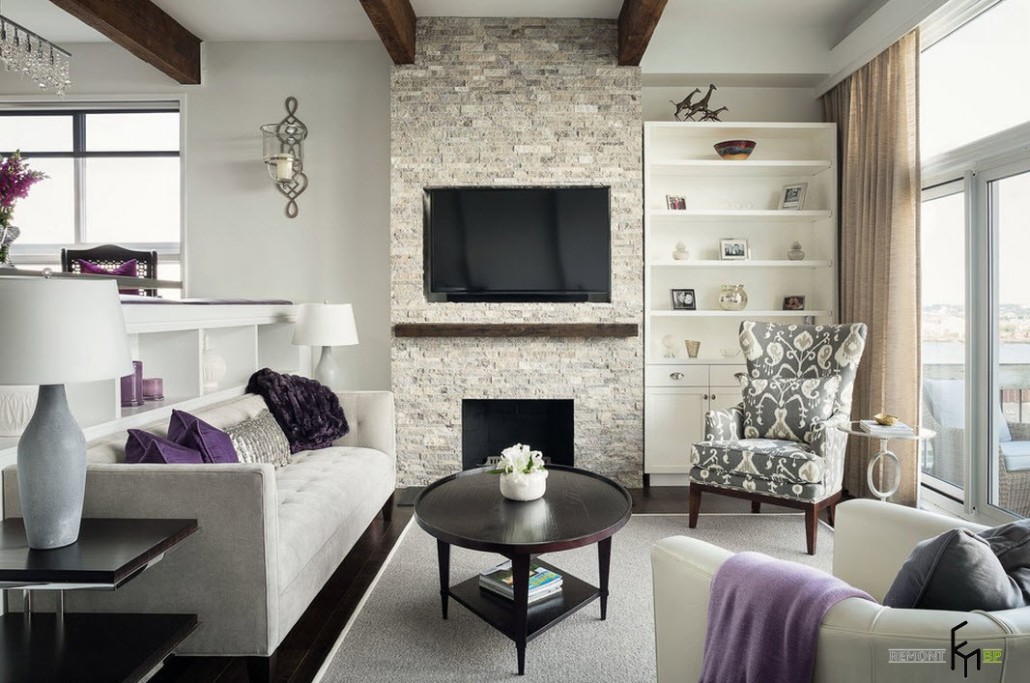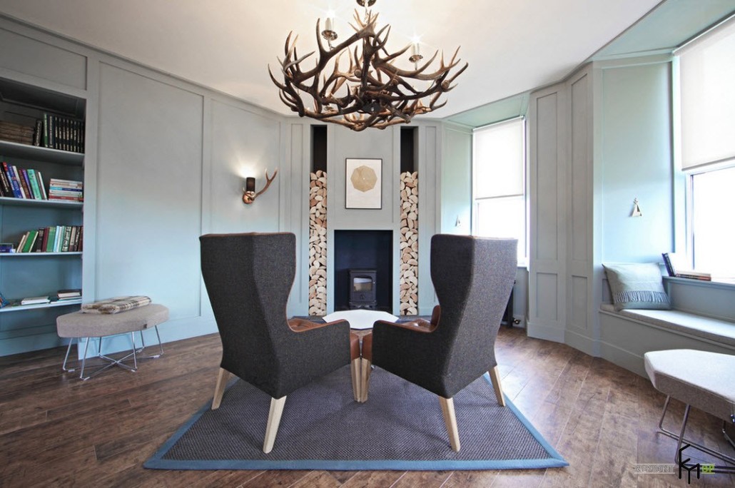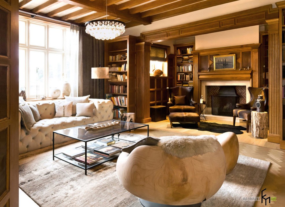 При наличии площади, превышающей 100 кв.м. вопрос эргономики гостиной остро не стоит. Этот факт позволяет достоверно воспроизвести приоритетный интерьер и выделить его стилистические особенности. Так, потолок, с уложенными темными балками, отлично рифмуется с деревянным полом без ущерба для метража, а светлые стены в тандеме деревянных панелей, создают эффектный контраст.Присутствие камина, высокие спинки мягкой группы, деликатные цвета стен, модульный паркет, фрагменты из камня подчеркивают престижность дизайна.