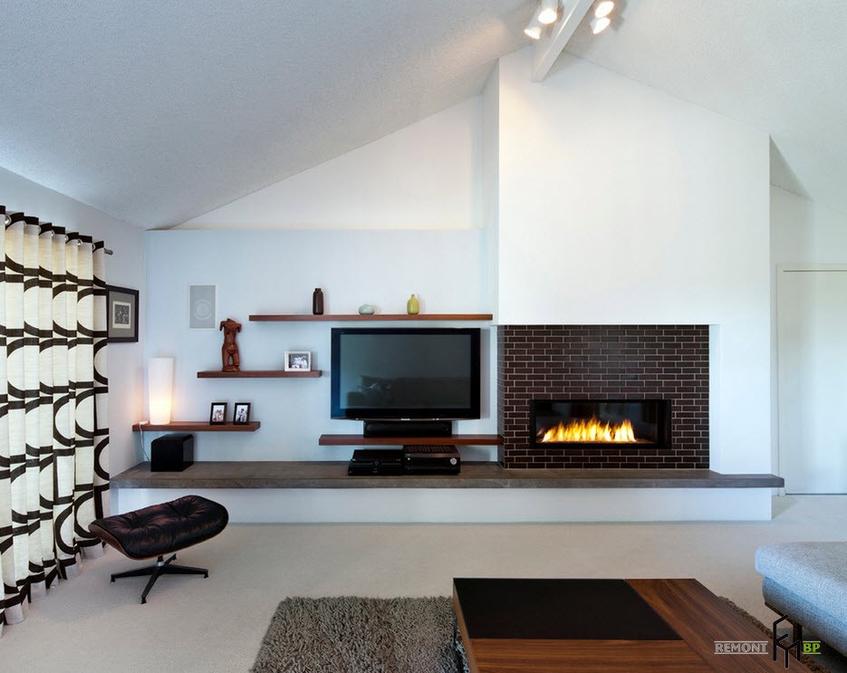 Хотя в традиционной интерпретации модерн отождествляется с лаконичностью форм и приглушенными тонами, комната в таком исполнении получается нарядной. Предметы обихода скрываются за мебельными дверками, для изготовления которых эксплуатируется дерево без внешнего декорирования, отчего корпуса выглядят габаритными. Тем не менее, дизайнеры нашли место для хромированных вставок и активно используют цветной пластик и стекло на фасадах. Силуэты и линии постоянно эволюционируют. Обозначенные факторы сглаживают стереотипное впечатление и игнорируют привычную сдержанность. Яркие фрагменты на фасадах из ДСП и технологичных материалов превосходно смотрятся в спокойном фоне гостиной и не раздражают даже скептиков. Длинные стеллажи решают проблему хранения, а встроенная мебель экономит площадь и скрывает возможные строительные недочеты.