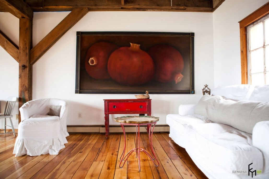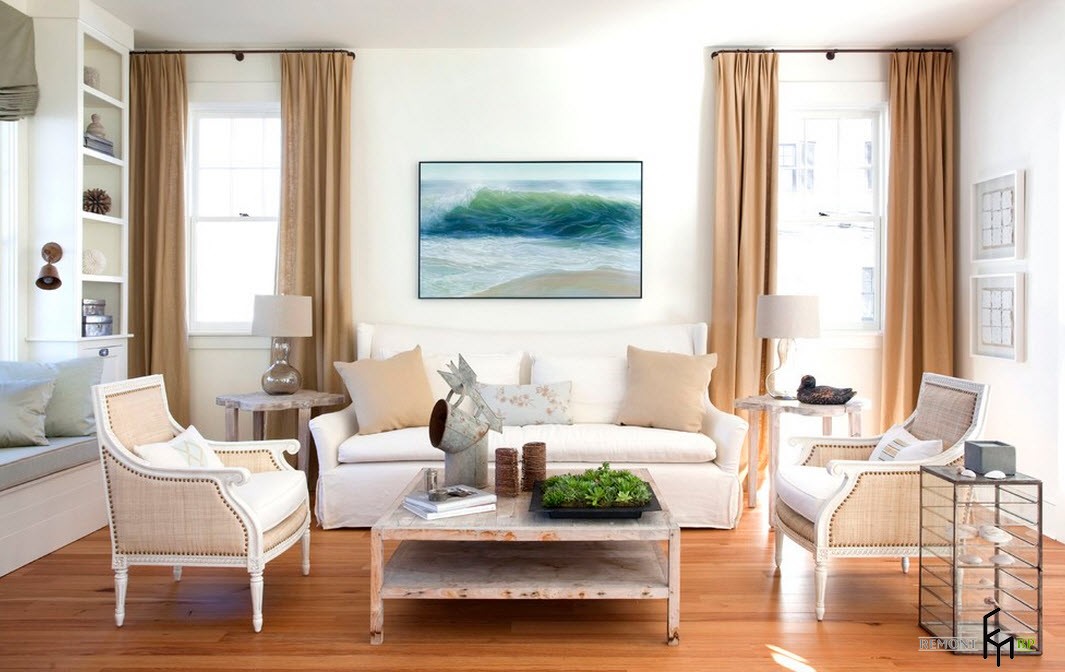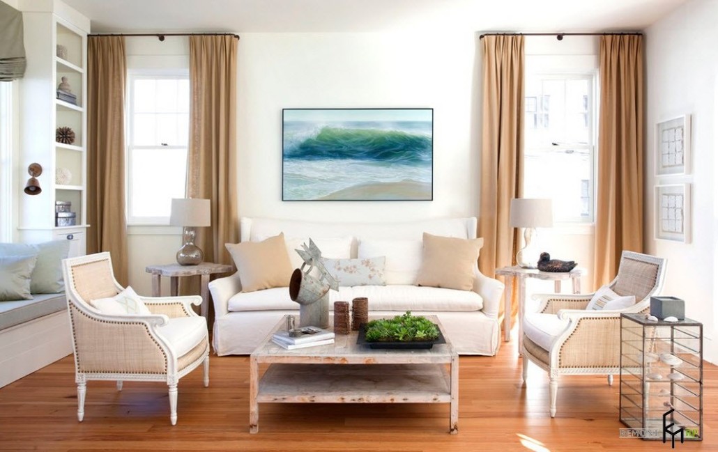Светлую краску из этой серии или обои с ненавязчивым узором уместно использовать в гостиной с северными мотивами. Идея основана на монополии экопродукции, хотя в обновленной версии, не исключается частичное использование современных материалов, от которых интерьер только выигрывает. Яркость дневного и вечернего света, чистый белый цвет, деревянные основания интерьерных групп несут тепло в белое безмолвие. Фасады украшает резьба, фигурные ножки и при этом не отвергаются прямые и точные линии корпусов в стандартных комплектациях. Часто используется плетеные предметы и такие же аксессуары. Нехитрый антураж обычно состоит из зеркал, картин, икебан, фарфоровых и глиняных предметов. Пестрые вкрапления формируются за счет подушек, ковра, сувенирных безделушек.