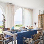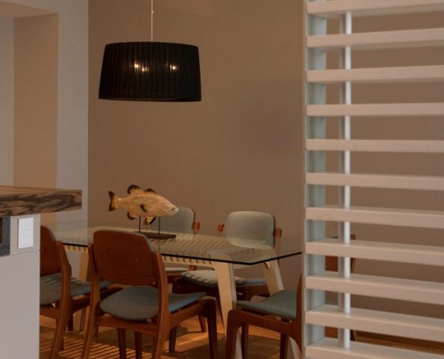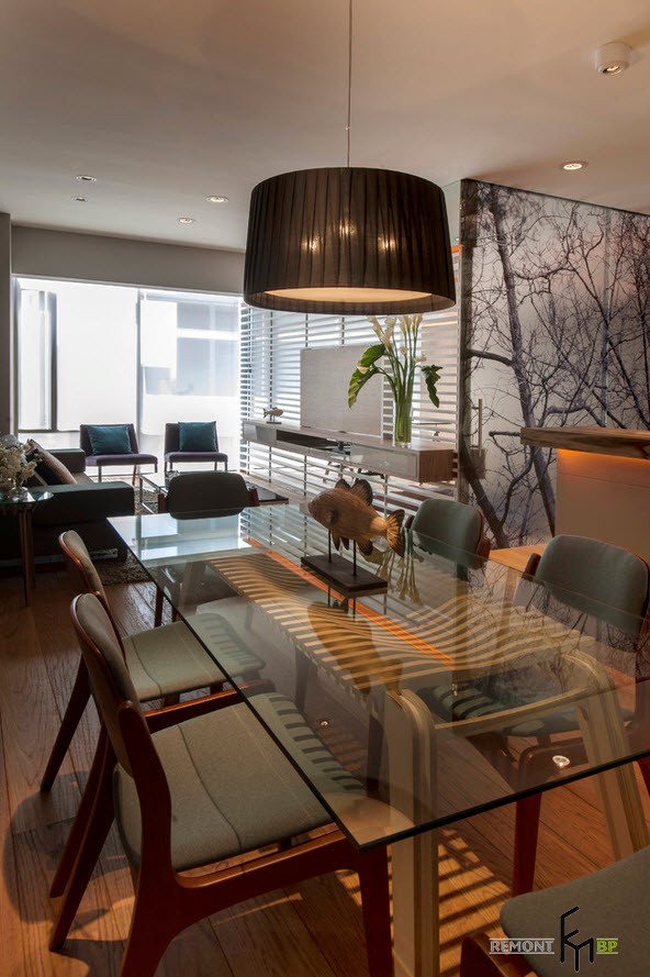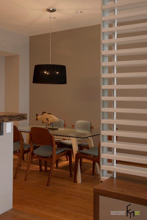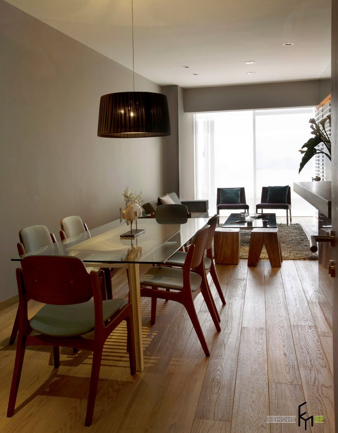Эта часть помещения является логическим продолжением гостиной – между двумя помещениями отсутствуют какие-либо перегородки. Обеденная зона представлена полноценным столом для принятия пищи и тремя парами кухонных стульев серого цвета со спинками. Большой стол играет важную роль при организации семейных мероприятий и в моменты приема гостей. Освещение пространства столовой производится при помощи отдельной лампы, расположенной над стеклянной столешницей.
