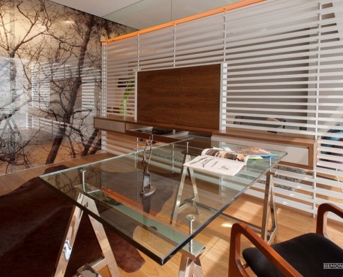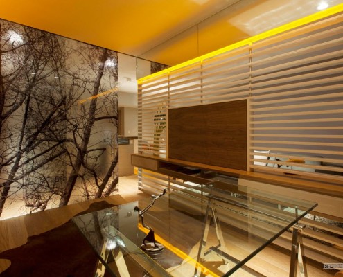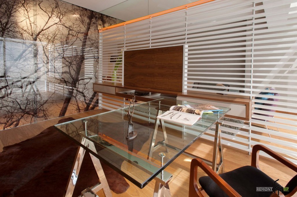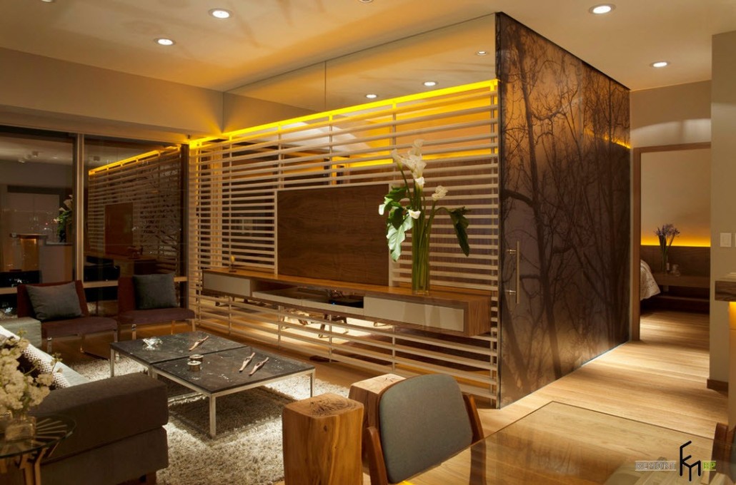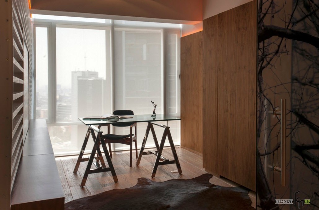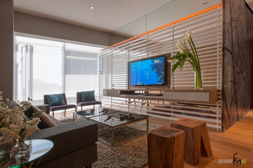 Центральная зона помещения, подобно всем остальным комнатам, оформлена в самом современном стиле. Тех, кто впервые заглянет в помещение, непременно поразит обилие солнечного света, проникающего в комнату со всех сторон. Превосходное естественное освещение в гостиной создается, благодаря большому окну, занимающему одну из стен комнаты. В качестве напольного покрытия дизайнерами выбран ламинат теплого светло-коричневого оттенка, отлично сочетающийся с общей обстановкой помещения. Мягкий ворсистый коврик неяркой расцветки в центре гостиной почти незаметен.