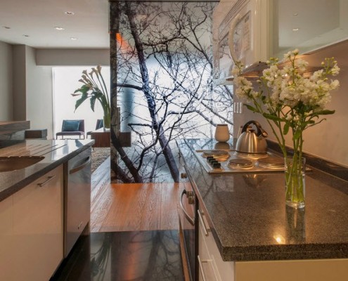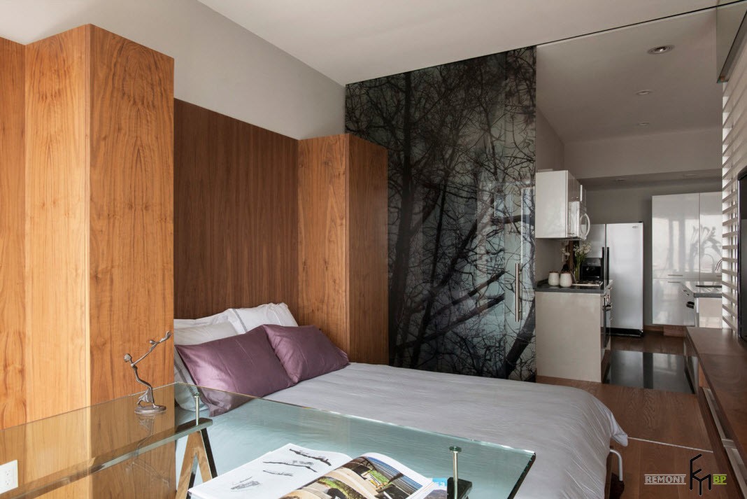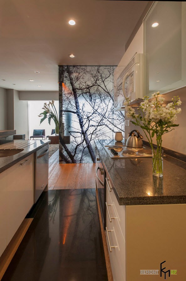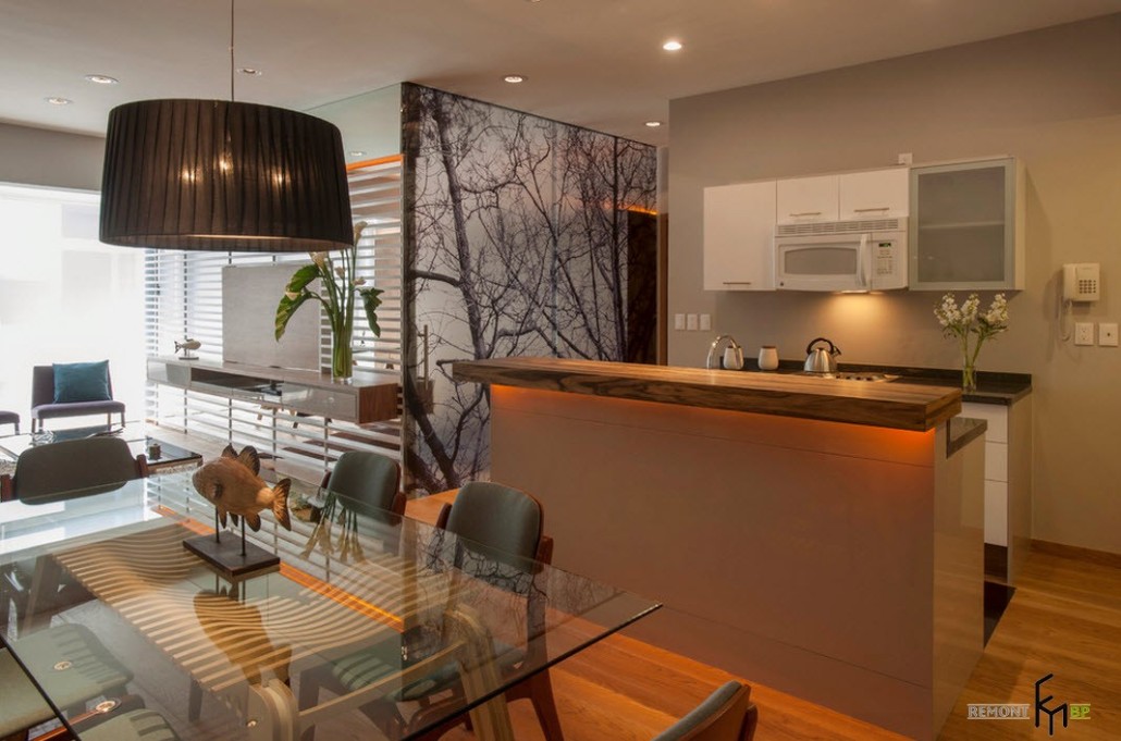 Чуть поодаль находится зона приготовления пищи, снабженная удобной барной стойкой, выполняющей также функцию разграничения кухни и столовой. От спальной комнаты кухонное помещение отделяется непрозрачной стеклянной перегородкой. Это функциональное пространство занимает в квартире незначительную площадь, однако, здесь имеется все самое необходимое для быстрого приготовления и разогревания еды.