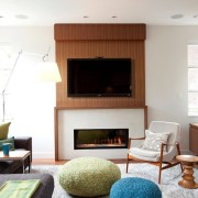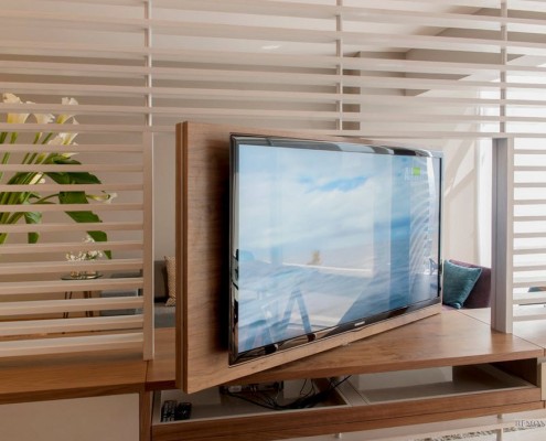 В комнате имеется большой телевизор с плоским экраном. Этот прибор делает весь интерьер еще более современным и функциональным. Панель, на которой закреплена плазменная панель телевизора, снабжена функцией вращения. Это позволяет собственникам квартиры пользоваться устройством и в гостиной, и в одной из спален.