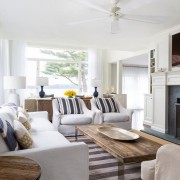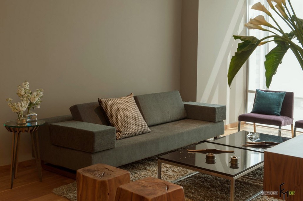 Мебель достаточно лаконична: прямоугольный диван и пара кресел простой формы с обивкой серо-фиолетового цвета дополняют общую цветовую гамму. В интерьере комнате имеются два небольших стола со стеклянными столешницами, выполняющих различные функции. Журнальный столик прямоугольной формы, изготовленный в стиле хай-тек, располагается в самом центре гостиной. Овальный стол из прозрачного стекла, стоящий рядом с диваном, играет роль декоративного аксессуара.